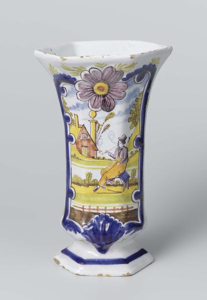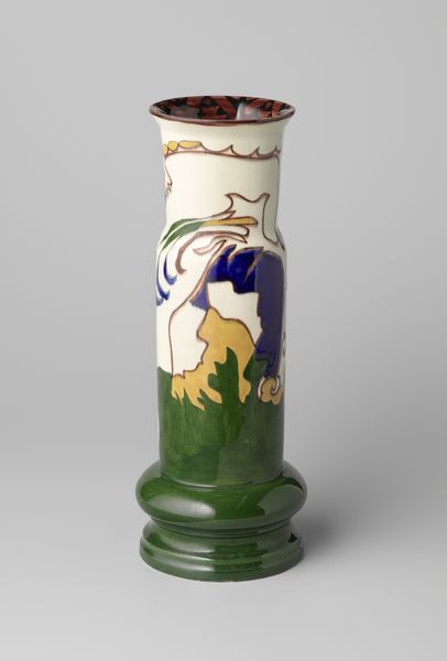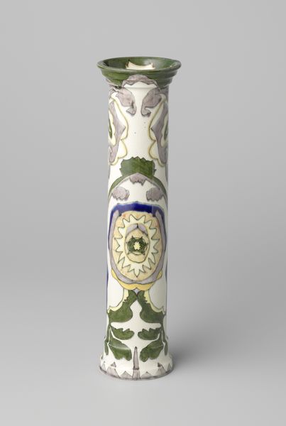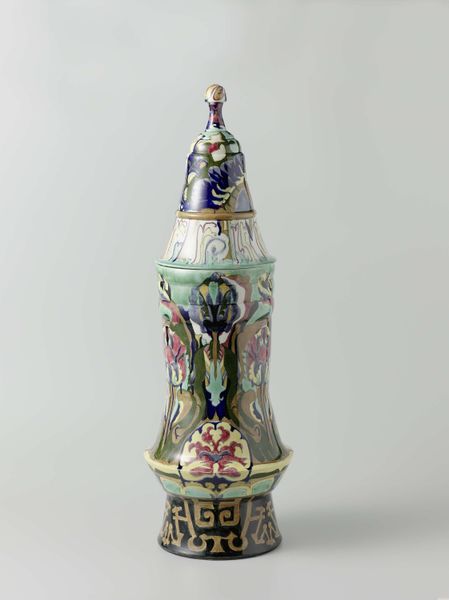 Curator: Well, here we have a fascinating piece titled "Vaas van aardewerk, veelkleurig beschilderd met gestileerde plantmotieven"—a vase crafted around 1905 by N.V. Haagsche Plateelfabriek Rozenburg. It is of mixed media construction using ceramic and earthenware techniques. My first impression is...eclectic! So many colors and seemingly clashing styles. Editor: Clashing? I see a vibrant attempt at harmonizing natural motifs with geometric forms! It immediately strikes me as a bold statement against the industrial age, clinging to the beauty of the organic through its floral depictions, but with this assertive geometrical frame for the painting. Curator: Ah, I can appreciate that read. What jumps out at me are these almost totemic, abstracted shapes. They look like stylized faces emerging from a jungle of foliage. It gives the vase a presence that transcends mere decoration, carrying with it a sense of ancient ritual, you might say. The geometric abstractions around the base act as symbolic anchors. Editor: Indeed! Rozenburg, I would say, tapped into a yearning for meaning amidst the anxieties of early 20th-century Europe. Notice how the botanical elements are stylized—not realistically rendered—becoming symbols themselves. Perhaps reflections of Art Nouveau's quest for integrating art into daily life but with strong references to traditional patterns from cultures near and far. It raises questions about colonialism, cultural appropriation, and the European gaze, too, because a work like this can, in a sense, flatten lived cultures onto single decorative works. Curator: A poignant critique. However, I wonder if it also indicates something more universal—the urge to locate the familiar, almost divine, amidst the natural world. It is, after all, the stylized patterns—those so-called appropriated designs—that bring this idea together for the maker. How this Rozenburg vase merges different world-views in such an overt, artistic expression of nature. What will this symbol of nature mean in the coming 21st Century? Editor: I concur—art allows such dialogues to happen. The clashing and coming together are key in art objects such as these. For me, seeing its message reframed again by someone in another time is part of the art piece. The discourse completes the work. Curator: Exactly, this vase shows us, in color and form, how those continuities and contestations create our culture—one vessel at a time.