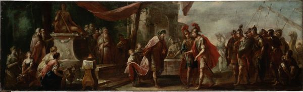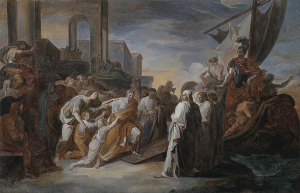 Curator: What we're looking at now is "Slutningsscenen af Johannes Ewalds 'Balders Død'," or "The Final Scene of Johannes Ewald's 'The Death of Balder'," painted between 1741 and 1782 by Peter Cramer. It's an oil painting currently housed here at the SMK. Editor: Oh, wow. First thought: drama bomb! Everyone's either weeping, fainting, or staring skyward. Is that Balder sprawled on the ground there? Looks like a Norse tragedy in progress. Very...stagy. Curator: Indeed. The piece illustrates the climax of Ewald’s play, drawing heavily on Norse mythology. Notice how Cramer uses the figures' reactions—grief, despair, resignation—to embody the profound sense of loss. Balder’s death is not just a personal tragedy, but a cosmic one. Editor: Absolutely. The lighting definitely helps set that tone—very theatrical, lots of shadow. It's like the universe itself is bummed out. Is that Odin floating above? He looks pretty bummed. Though I must admit, their puffy sleeves and hairdos do look pretty funny. I suppose they did the best with what they had. Curator: The romanticized elements you're sensing stem from the period's interest in nationalism and the Norse past. Artists used these stories to explore ideas of heroism, fate, and cultural identity within the context of eighteenth-century Denmark. Also consider Cramer’s careful placement of the figures—the active mourners versus the more stoic, observant characters. Editor: True, there’s a certain... stiffness to the emotion. Like they're performing grief. But maybe that's part of the charm. I can't decide how I feel about those expressions—almost cartoonish with their overt displays of sorrow! But this must've been a wild sight back in the 1700s when these Norse epics were coming to light again! Curator: It's a testament to the work's layers. While the overt theatricality may strike contemporary viewers as somewhat contrived, its original audiences found deep resonance in the subject matter and its implications for Danish identity and cultural heritage. Editor: You're right, you're right. Seeing the history of storytelling, as told through paint... Makes my brain hum! Alright, Peter Cramer. Thanks for the existential dread...and the historical dress-up party! Curator: A fruitful reminder, then, of the dynamic interplay between past and present in shaping both artistic creation and our understanding of it.