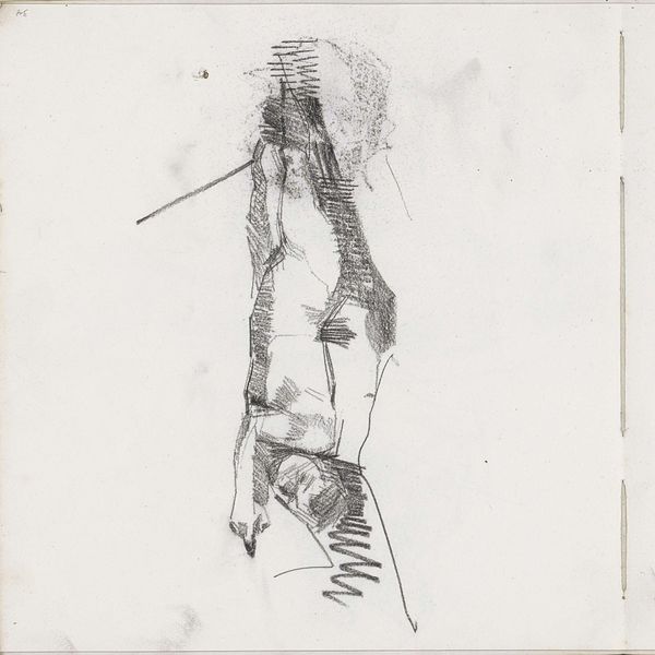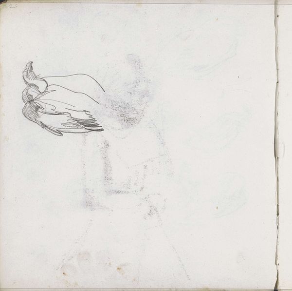 Curator: This is "Vogel, mogelijk een gier," or "Bird, possibly a vulture," by Isaac Israels. We believe it was created sometime between 1875 and 1934. It’s a pencil and graphite drawing. Editor: It strikes me immediately as rather mournful. The heavy shading gives a somber, almost oppressive feeling. Is that just me? Curator: No, I see it too. Look at the way Israels uses line. The broad, quick strokes imply volume, yes, but also a certain weightiness. The bird is hunched, its head buried… there’s a clear sense of introspection, of being burdened. Editor: Given that vultures are associated with death and decay, that burden could be read metaphorically. It almost seems a commentary on social ills or perhaps the artist’s anxieties about…well, anything! Curator: It is certainly possible. However, notice how the sketch is unfinished, almost ephemeral. Perhaps this is simply an artist experimenting with form, exploring tonal variations within a limited palette. We could see it as a purely formal exercise. Editor: I concede the drawing’s technical merit, but to disregard the vulture’s symbolism feels willfully blind. Israels lived in a time of intense social upheaval and industrial change, and a figure like this… a creature feeding off what others have left behind? It resonates. Plus, the quick, sketch-like rendering contributes to a feeling of urgency or discomfort, don’t you think? As though he needed to capture it immediately? Curator: I see your point about urgency, and the contextual backdrop undeniably adds layers to the reading of this work. It’s always tempting to infuse the artwork with the artist's personal feelings and the cultural moments… I suppose a degree of skepticism allows us to remain open to multiple perspectives. Editor: Agreed. Ultimately, "Vogel, mogelijk een gier" gives us a space to consider both the aesthetics of form and its relationship to the circumstances in which it was made. It asks us to consider, on one hand, Israels mastery of material but, more important, the vulture in society then and now.