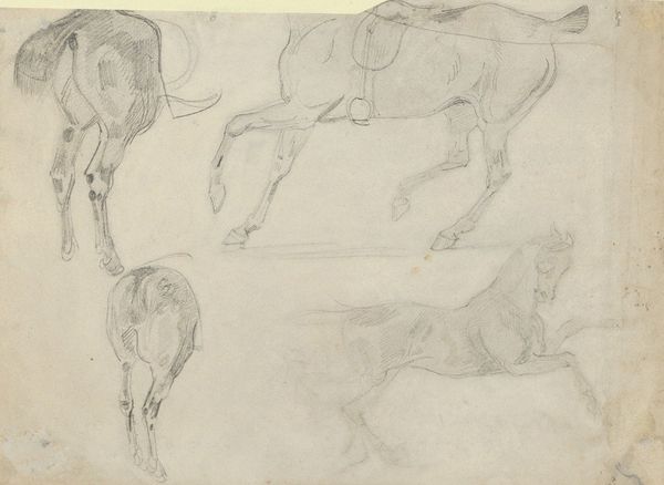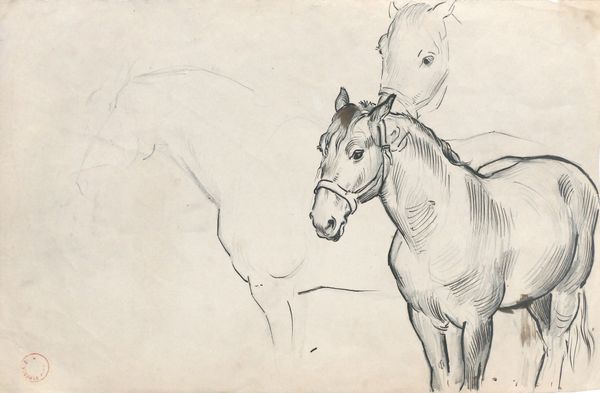 Curator: This is George Hendrik Breitner's "Man with Two Horses," created in 1873. The piece, rendered in pencil, offers an intimate glimpse into the artist’s observational study. Editor: The preliminary, almost ethereal quality is striking. There is such visible lightness. It looks more like a fleeting impression rather than a definitive, grounded scene. Curator: Precisely. It is evident that this drawing exists within the tradition of sketching; a practice fundamental to artistic development in the 19th century. The Rijksmuseum collection demonstrates that Breitner repeatedly adopted drawing as an analytical and preparatory tool. How would you describe the composition's structure? Editor: I see that the figures of the two horses establish a clear horizontal axis, and the tentative hatching lends them an interesting three-dimensionality, despite the spareness of the medium. The soft transitions of tone also create subtle contrasts across the page, which suggests a sense of atmospheric perspective even if the context lacks definitive surroundings. Curator: We could analyse the absence of distinct background elements here. By forgoing elaborate setting, Breitner is directly calling our attention to the fundamental structure and articulation of these equine figures, perhaps as an exercise in the fundamentals of realism. Editor: Agreed. This makes me wonder what his commission and patronage situation looked like during that early period of his career. Who were the societal players involved and to what degree did they allow the development of more personal preliminary sketches like these, relative to their more formalized work? Curator: Fascinating questions, underscoring how Breitner's economic conditions were crucial in directing him to paint more of these scenes, contributing greatly to the public role and overall perception of his artistic oeuvre. I see in these quick marks an understanding of not only anatomy, but also of movement—a sensitivity to the character of his subjects. Editor: I concur entirely. The unforced simplicity is almost daring and adds great emotional strength. Well, it is pieces such as these that really bridge the temporal distance separating artist from observer. Curator: Indeed. Examining Breitner’s sketch allows for a richer understanding of the artistic processes driving cultural narratives of the late 19th century, and the importance of seemingly simple gestures like these initial renderings.