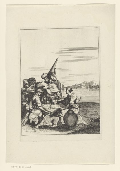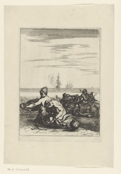 This etching presents a coastal scene teeming with symbols of trade and the exotic, rendered by an anonymous hand. Dominating the foreground is a semi-nude figure, his posture and expression evoking a sense of wonder or perhaps distress. Note the recurring motif of the boat, laden with figures and goods, set against the backdrop of a distant ship. This imagery echoes the classical theme of passage, reminiscent of Charon ferrying souls across the River Styx, yet repurposed here to symbolize mercantile exchange and perhaps the transport of enslaved people. The juxtaposition of the vulnerable figure on the shore with the activity on the water introduces a tension, highlighting the human cost of exploration and trade. The emotional charge of this scene is palpable, inviting us to consider the psychological impact of cultural encounter and the enduring legacy of these historical narratives. The imagery resurfaces and evolves, reflecting our ongoing struggle to reconcile progress with its profound human implications.