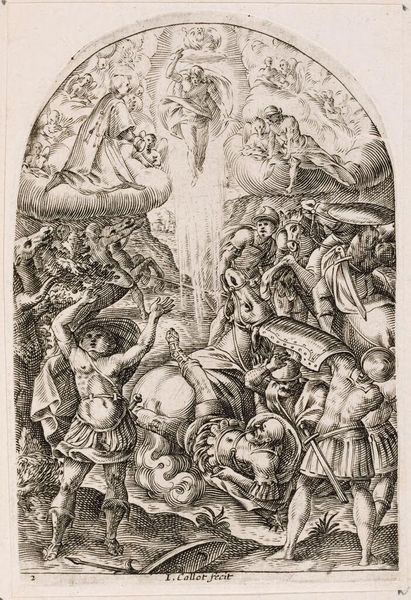 Curator: Jacques Callot's "Paradise" unfolds before us like a dream, a meticulously etched vision of the afterlife. Editor: It feels so incredibly hierarchical, even in its supposed transcendence. The seated figures at the center command so much visual authority. Curator: Callot really excelled at capturing the textures of fabric and skin with just the burin, it’s a bit heavenly in itself. Editor: Considering Callot's context – the Counter-Reformation – this idealized scene is fraught with the power dynamics of salvation and damnation. Curator: Perhaps, but I find a tenderness there, too. The way the light seems to emanate from each figure, each face. Editor: Well, it certainly provokes reflection on who gets to define "Paradise" and whose experiences are centered in such narratives. Curator: Indeed, it’s quite a lot to unpack. Editor: Absolutely.
