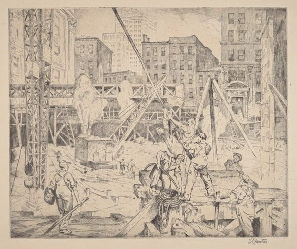 Curator: This is Riva Helfond's "Protest," a compelling print believed to have been created sometime between 1935 and 1940. Editor: My initial sense is that this image feels deeply somber. The stark black and white, combined with the dense crowd, evokes a feeling of tension and unrest. Curator: The composition is quite striking. Notice how Helfond employs sharp contrasts in tone to guide our eye, leading us through the layers of figures. Semiotically, the raised flags and the slumped figure being carried suggest themes of patriotism and sacrifice. Editor: For me, the materiality speaks volumes. Given the probable era, I’m thinking about the labor required to create a print like this, and the kind of person that would invest the time in this process given what it is showing. I suspect it might point towards a profound engagement with labor rights. Curator: Yes, there’s definitely a dialogue with social realism here, reflected in its figuration and attention to urban space. The perspective flattens, amplifying the expressive quality. You see hints of Expressionism here as well. Editor: I agree. Consider the production of paper in the 1930s. Access to quality materials would have been far from guaranteed. Every sheet would represent resources and labor—a powerful thought when observing a work of this nature and scale, and seeing it focus on this street scene. Curator: Its engagement with narrative conventions associated with history painting, typically grandiose, becomes very interesting when presented on such a potentially widely distributed medium like print. It brings the themes of protest closer to the public. Editor: I find the contrast between the lifeless figure being carried, versus the seeming passion from the other participants, particularly engaging, prompting us to really consider labor issues through these materials. Curator: The work leaves us contemplating not only the social conditions Helfond depicts but also the role of art itself as a witness and agent of social change. Editor: Ultimately, examining the physical processes reminds us how materials and actions, like protesting and printing, embody both artistic expression and political intent.