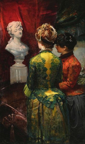Curator: This is Alfred Stevens' "The Japanese Robe," painted around 1872. A striking example of genre painting mixed with elements of Japonism. Editor: The coolness of the blue robe is immediately arresting, particularly against the warmer reds of the interior space. The textural differences jump out. Curator: Indeed. The robe itself, its patterns and color, speaks to a broader European fascination with Japanese art and culture in the late 19th century. We see this cross-cultural pollination throughout Impressionism. The question of Orientalism invariably arises, of course, when considering the dynamics of cultural appropriation. How can we consider its presence here? Editor: From a purely formal standpoint, the reflections introduce complexities of line and light—an investigation into doubling and image making itself. Look at the confident brushstrokes that suggest depth but also flattening planes; how would you respond to its implications? Curator: I see that. But look closer, at the woman herself, her back turned, seemingly lost in contemplation of her reflection. It prompts questions about the gaze – who is she performing for? Her presence suggests themes of identity and perhaps even female subjectivity within the confines of domestic life and what these implied expectations can represent through performance, even privately in self-regard. Editor: Yes, the composition teases with ambiguity. Is it really a performance? The off-center positioning contributes to a feeling of quietude rather than spectacle; it is more private meditation than public action. It appears, as a subject, she contemplates her subject. Curator: It's a complex painting, isn't it? One that offers numerous avenues for exploration when viewing considerations that impact society across identity and cultural values within intimate and familiar landscapes. Editor: Precisely, the painting’s formal arrangement generates so many open questions. And hopefully invites others to keep asking questions as they regard Stevens' interesting approach.