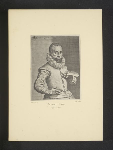 Editor: So, this is a reproduction of an engraving of Anton van Opstal, dating from before 1877, by Joseph Maes. It's printed in ink on paper. I find it intriguing, how a copy can still hold so much character and the starkness almost feels modern, despite the subject's baroque attire. What stands out to you in this portrait? Curator: It’s compelling, isn’t it? I see a conversation, perhaps even a quiet rebellion. Here we have a reproduction – immediately inserting it into a discourse about originality and value. Anton van Opstal was a painter in his own right. But think about what it means to reproduce his image, to circulate it. Whose gaze are we inheriting and perpetuating here? How does this image speak to notions of authorship, representation, and the social hierarchy inherent in portraiture of the period? Editor: That's a fascinating point about authorship. I hadn't considered the power dynamic in reproducing someone's image. Curator: And beyond just the act of reproduction, let's consider the sitter's gaze and gesture. He's pointing—drawing attention. To what, though? Is he directing us, accusing us, inviting us into something? The artist has immortalized a man, but the act of reproducing ensures copies of him. What does that say about power then and the commodification of image making then? Editor: So, it becomes less about the individual and more about the idea of Anton van Opstal and about male portrayal. I’m also curious about the historical context of this image as a reproduction. Was it meant for a wider audience than the original? Curator: Exactly! It shifts the work from a celebration of individual accomplishment to participation within in a network of social production and political dialogue. Understanding the context of its reproduction unlocks those questions of accessibility and intended audience, disrupting conventional art historical narratives. Editor: I hadn't considered all those layers of meaning embedded in something that seemed like a simple portrait. Curator: That's the power of engaging with art through a critical lens. It allows us to see beyond the surface and understand the complex web of power, representation, and social meaning that these images carry.