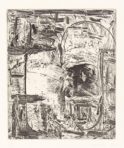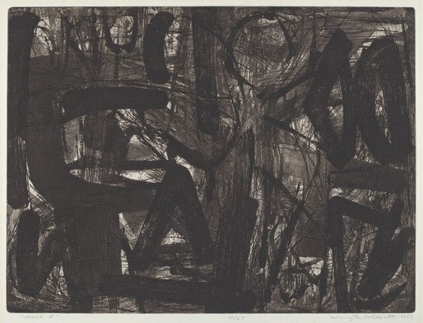 Editor: Here we have "May 26th," a print by Roland Ginzel from 1956. It strikes me as a pretty chaotic composition, all these sharp lines and fragmented shapes. What do you see in this piece? Curator: Chaos, definitely, but perhaps a very specific kind. Look at the date – 1956. What was happening then, culturally and politically? The Cold War was escalating; anxieties about nuclear proliferation were widespread. Do you think this explosion of fractured forms might be reflecting some of those anxieties? Editor: That's an interesting thought! It's easy to get lost in the abstraction and forget the historical context. So, you see a connection between the artwork's fragmented composition and Cold War anxieties? Curator: Precisely! Abstraction became a powerful language for expressing the unspeakable – the trauma of war, the fear of annihilation. Also, think about Ginzel as an artist working within a specific social context, possibly feeling silenced or unheard. The non-representational allows for critical commentary without direct confrontation. Who benefits and who is silenced by the narratives we build? Editor: That makes a lot of sense. I hadn’t considered how the abstract style itself could be a form of resistance. It opens up so many more questions than it answers! Curator: Indeed. And that's the power of art. It challenges us to consider the socio-political forces shaping our perceptions. Now, looking at this work, do you feel empowered to critically analyse structures around you? Editor: Definitely. I'll never look at an abstract piece the same way again. Considering it in the context of its time makes it so much richer and relevant. Curator: Exactly! Let's strive to be actively engaged with the stories and lived experiences represented by the art surrounding us.