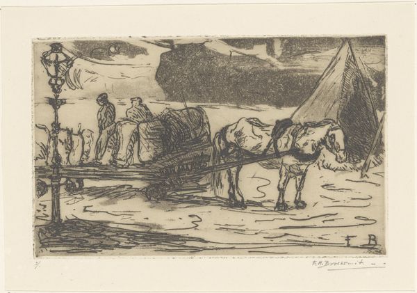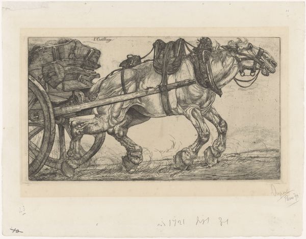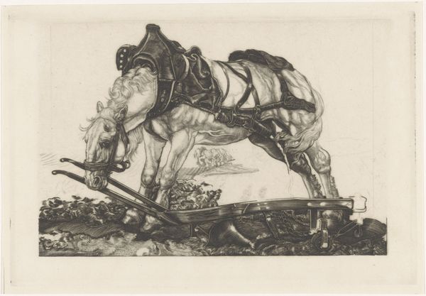 Here, we have Pieter Dupont's etching, "Ploegpaard aan de oevers van de Seine." The scene is dominated by a large, muscular horse, meticulously detailed with fine lines that capture its texture and form. The composition is arranged to draw the eye immediately to the horse, which takes up most of the frame and is centrally located. Dupont uses an intricate network of lines to define the horse’s muscular structure and heavy gear. This emphasis on detail extends to the landscape, where each stroke seems purposeful in creating a tactile experience of the earth and water. The use of etching allows Dupont to explore the interplay between light and shadow, which gives depth to the subject. The horse is presented not merely as an animal, but as a figure of labor. Dupont’s work invites us to think about the representation of work, nature, and the human imprint. The image is rich with details which encourage endless interpretation.