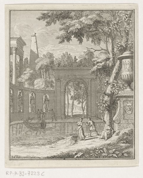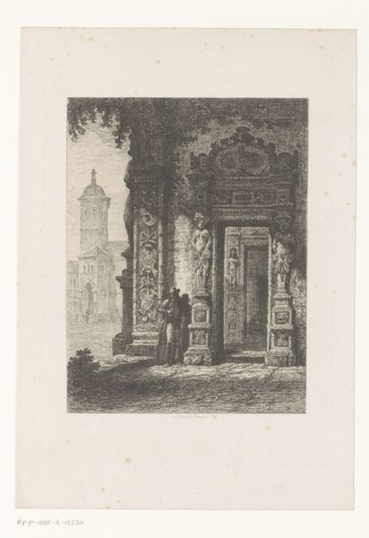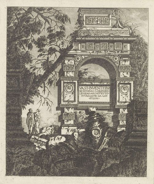 Curator: Looking at this image, I’m immediately struck by how it feels like a stage set—something grand, but also slightly crumbling. Editor: Indeed. What we're viewing is "Frontispiece, plate one from Vasi Invention" possibly created between 1768 and 1770 by Jean Laurent Legeay. The artwork is currently housed at The Art Institute of Chicago. As a print using etching, engraving and ink on paper, it perfectly exemplifies the Neoclassical movement's fascination with antiquity. Curator: I'm drawn to the detail of the line work; it’s all so deliberate. You can almost feel the pressure of the engraver’s tool on the copperplate, and the quality of paper onto which it's imprinted. Also I’m wondering, how was this kind of print distributed? Was it affordable? Editor: That's a critical point. Prints like these, due to their relative affordability, became vital tools in disseminating architectural ideas across Europe. Consider Legeay's position within artistic circles in Rome, for instance; he trained a number of influential figures, like Charles Percier and Pierre-François-Léonard Fontaine. Curator: Right, so it's not just about the final image, but also about the means through which it's disseminated—influencing architectural production, style, and even taste across social strata. You could consider this from the perspective of a design object meant for a particular class. It suggests Neoclassicism wasn’t a spontaneous eruption of style but instead one manufactured via collaborative work. Editor: Exactly. Furthermore, the very subject of the print plays a role. We're looking at a fantastic re-imagining of a Roman triumphal arch—a loaded symbol meant to broadcast the power of the empire, especially with those Roman figures off to the left adding to the grandeur. Curator: Well, examining how such Neoclassical imagery seeped into the everyday lives of individuals provides a tangible link between artistic ideals and material culture, no? We might also consider the economics of printmaking. Editor: Absolutely. In examining Legeay’s “Frontispiece”, we find how prints actively fostered the era’s fascination with classical antiquity, all whilst reflecting upon social factors underpinning its means of production. Curator: I agree; it gives me a fresh outlook to consider prints not just for their imagery, but as a distributed medium that reshaped artistic and political perceptions.