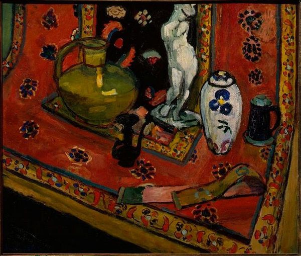 Curator: This is "Harmony in Yellow," painted by Henri Matisse in 1927. It’s an oil on canvas, capturing an intimate domestic scene. Editor: Wow. First impression? Overwhelming. Like, every inch is doing its own thing, and somehow, it works. Chaotic serenity, maybe? It feels...very Matisse. Curator: Absolutely. The composition and use of color speaks volumes. You see the figure, presumably a woman, is reclining, perhaps napping, amidst a carefully constructed tableau of objects and patterns. Consider the yellow, not just as color, but as a unifying principle in play here. Editor: The yellow IS key, isn’t it? It bounces around – the curtain, the fruit, the ground...like a visual echo. Almost dizzying. What I’m getting from this work is this feeling that the artist delights in the arrangement itself and feels comfortable in playing with flattened perspective and patterns. I'd say I feel the intention behind painting more than the story behind it. Do you feel the same way? Curator: Well, Matisse often used interior settings to explore states of mind. Intimacy as theme is important to the history of domestic interiors like this. What you see as playful I see as a continuation of symbols, but the beauty of this work, I believe, is that a cup of tea transforms into a signifier of domesticity, peace, and femininity and makes it timelessly recognizable to a diverse array of people across time and space. Editor: Right! Okay, so I see your point on symbols because he brings everyday items, like that teacup you mentioned, together and transforms them into art with those expressive colors and lines. Curator: The layering of the painting technique—the bold colors against the various decorative motifs—lends the work this almost dreamlike quality, as if we’re peeking into someone's private, sun-drenched reverie. Editor: Sun-drenched is spot on. There's such vibrancy, despite the stillness. The patterns remind me of wallpaper in a very chic, artsy living room. The patterns act as cultural and intimate reference points. It makes me feel that that intimacy exists beyond the space itself. It’s reaching into shared experience! Curator: Ultimately, “Harmony in Yellow” captures an equilibrium. The bold contrasts resolve themselves into an unexpected balance. The longer you gaze, the more intricate the connections become. Editor: True, I came in thinking: whoa too much!, but I see it now...there's some deeply fascinating artful harmony emerging.