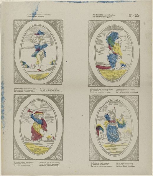 This is an undated print made by Pellerin & Cie., titled "Het geitje en de wolf", which translates to "The Goat and the Wolf." The narrative unfolds in a series of circular vignettes framed by floral designs. Here we see a darker side to childhood tales and the traditional power dynamics they reflect. The wolf, a figure often associated with cunning and predatory behavior, attempts to infiltrate the domestic sphere of the goat. The goat, in turn, symbolizes innocence but also a vulnerability that is tested. The story touches on themes of deception, danger, and the loss of innocence. The emotional tension is palpable, inviting viewers to reflect on the moral lessons embedded within such tales. This work prompts us to consider how we tell stories and how these narratives shape our understanding of power, vulnerability, and the complexities inherent in the human, or in this case, animal condition.