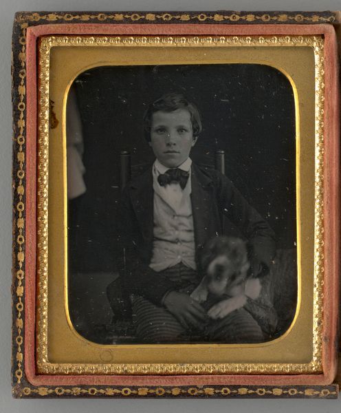 This daguerreotype, a photographic print from an unknown artist, presents a portrait of a boy. The most striking feature is the steady gaze of the boy. His eyes, fixed directly on the viewer, are windows to an inner world, a common motif throughout portraiture. Consider the ancient Roman tradition of the "imago," the death mask, and the Victorian post-mortem photography; both attempt to capture and preserve a likeness, to hold onto a fragment of a life. Here too, the unflinching gaze speaks to our desire to immortalize, to defy the relentless march of time. Think of the Fayum mummy portraits; these painted panels were attached to mummies, offering a vivid, lifelike representation of the deceased. The eyes, often wide and alert, were believed to ensure the deceased could still see and interact with the world of the living. These symbols are constantly repeated, and passed down through history. This boy’s direct, unwavering stare transcends the personal, tapping into a collective memory of loss, remembrance, and the yearning to connect with those who came before us.