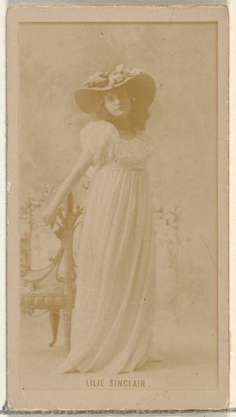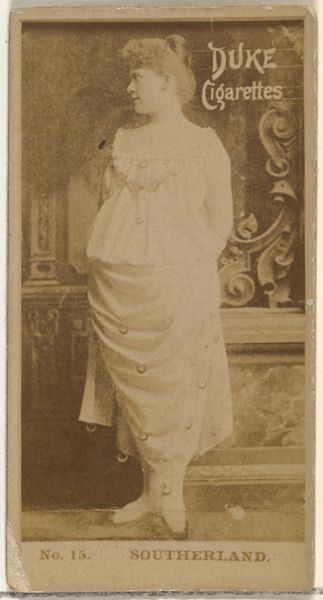 This photographic print of Isabelle Irving, part of the Actors and Actresses series, was issued by Duke Sons & Co. to promote Duke Cigarettes. The delicate sepia tone and soft focus create an ethereal, almost dreamlike quality, evoking nostalgia and a sense of idealized beauty. The composition is carefully structured to emphasize Irving’s figure, posed elegantly in a light-colored dress with puffed sleeves, holding a hat adorned with flowers. The backdrop, though blurred, hints at a textured wall, adding depth to the image. The limited tonal range focuses our attention on the interplay of light and shadow, defining the forms and contours of Irving's figure. Considered as a sign, Irving, the actress, signifies beauty, grace, and aspiration. The choice of a popular actress to promote cigarettes speaks volumes about the cultural codes at play. Beauty and success become inextricably linked to the product, inviting consumers to participate in this world of glamour. This highlights how commercial imagery functions not merely as advertisement, but as a complex system of representation that shapes desires and identities.