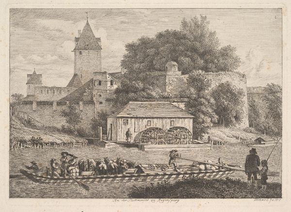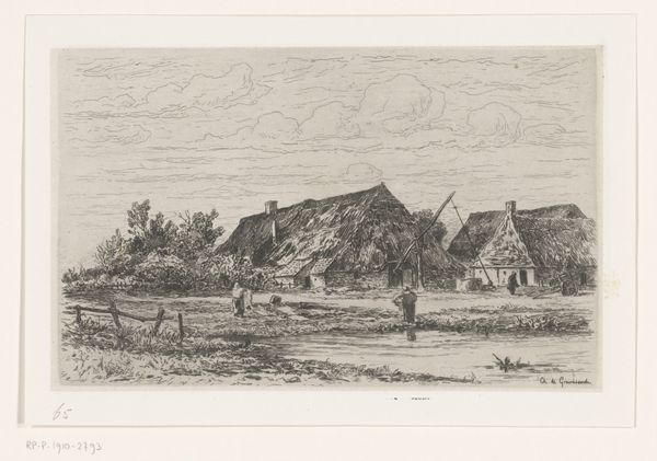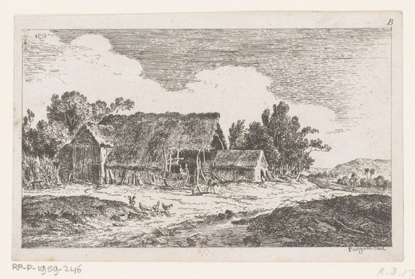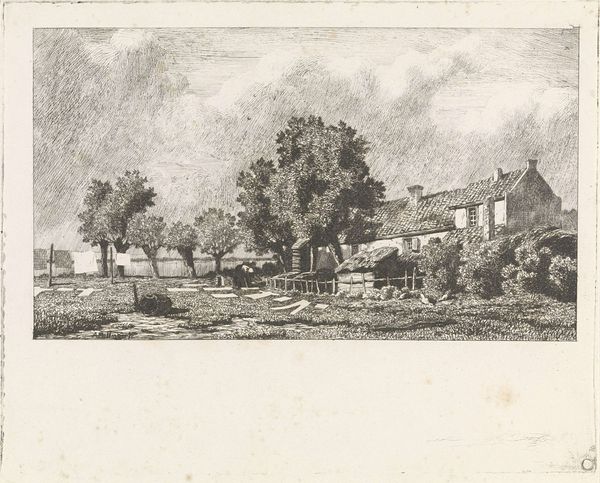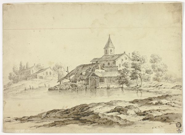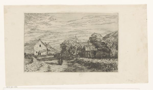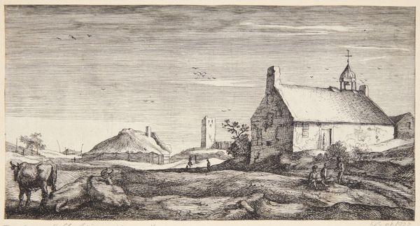 Curator: Here we have Jens Peter Lund's "Skullel\u00f8v," an engraving made in 1840. Editor: It's a hushed, almost reverent scene. The precision of the lines, the muted tones...it speaks of quietude. There's a rhythm to the forms that is almost hypnotic. Curator: The subject is Skullel\u00f8v, probably its church. I think Lund captured a visual echo of something enduring in Danish cultural memory here. You see this image and recall old traditions. Editor: The steeple rises centrally but seems like part of the overall layout. The horizon, however, recedes to offer almost nothing to fix our attention to in order to make the landscape almost completely about the little collection of homes below. What's striking is how Lund handles light. He focuses the line work, concentrating value to show form, the negative space letting it breathe. Curator: Indeed. Light symbolizes truth, faith, divinity. This almost naive rendering enhances the symbolic dimension. The village isn't just houses, but vessels holding beliefs and heritage. These homes as symbolic containers... Editor: Vessels indeed, each structure marked by unique pen strokes. It has such simplicity, a directness that many engravings often lack. One can almost envision the engraver sitting and watching and drawing... Curator: Consider this work within the context of early 19th century nationalism; I imagine it was comforting in a way to be reminded of cultural origins through idealized imagery. Editor: Looking at the lines closely, the houses each have some irregularities to mark them, suggesting they might speak not only of continuity, but maybe more individuality than initially meets the eye... Thanks to its structural clarity, it reveals itself slowly. Curator: So, this tranquil depiction, I believe, asks us to acknowledge the subtle power held within tradition and its ability to root identity through tangible symbols. Editor: The overall feeling is not just continuity but intimacy in time... Well observed!