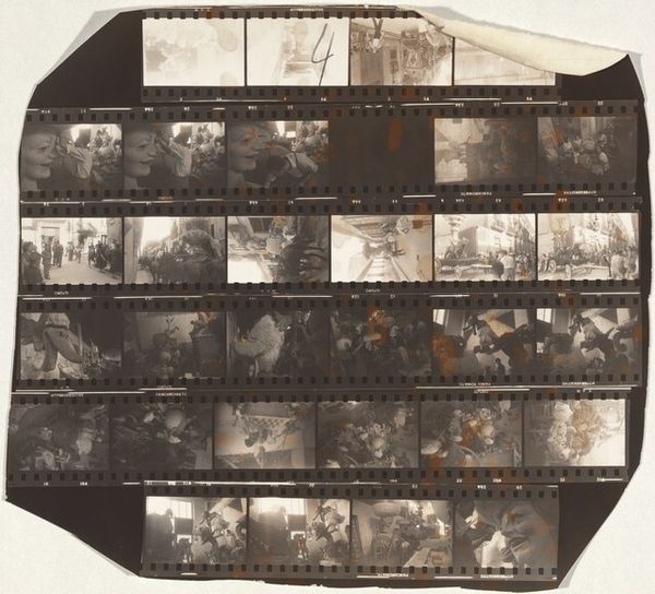 Editor: We're looking at "Flower festival--Spain 5" by Robert Frank, a contact print from 1952. It has a kind of fragmented, almost dreamlike quality. What strikes me is the way the images are juxtaposed – they feel connected, but I’m not sure how. How do you interpret this work? Curator: This piece encapsulates Frank's approach to documenting the nuances of lived experience, particularly within marginalized communities. Think about Spain in 1952, still reeling from the civil war and living under Franco's oppressive regime. These aren't celebratory snapshots of a festival, but glimpses into daily life framed by political tensions. Editor: So, you’re saying the festive title might be ironic? Curator: Precisely! Look at the composition – the stark contrasts, the gritty textures. These are visual cues suggesting something beyond the surface-level joy of a flower festival. Frank often focused on the unspoken realities, the social divides, and the resilience of ordinary people facing adversity. How does that lens change your initial interpretation? Editor: It does recontextualize everything. I was so caught up in the aesthetic of it, I didn’t think about the political landscape at the time. The fragmentation now speaks more to fractured societal structures, doesn't it? Curator: Exactly. By viewing "Flower Festival—Spain 5" through this lens, we move beyond a purely formal analysis and engage with a powerful statement on social inequality and political resistance, subtly embedded within seemingly ordinary scenes. It makes you think about the photographer's own position, too, as an outsider looking in. Editor: That’s fascinating. I'll definitely remember to dig deeper into the socio-political context moving forward. Curator: Absolutely crucial. Always question whose story is being told, and how.