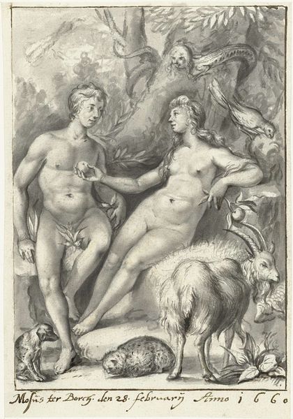 Curator: Oh, isn't this wild? At first glance, it's like a mythological soap opera caught in a tangled cloud! The engraving by Hendrick Goltzius, titled "Jupiter and Juno," done sometime between 1575 and 1607. Editor: "Tangled cloud" is putting it mildly! The whole thing swirls like a baroque hurricane, even down to the details of that serpent! Is it me, or is there something almost…comical about it? Jupiter looks a bit like he's had a rough night, doesn’t he? Curator: Indeed, Goltzius infuses it with a sort of exaggerated humanity, despite the classical subject matter. The piece uses allegory, representing Jupiter and Juno, king and queen of the gods. Its place here at the Rijksmuseum really brings the history of the era into view; the Dutch Republic was interested in power and morality, and mythological images, although bawdy at times, were popular carriers of such societal concerns. Editor: That adds an interesting layer to what appears at first like just a standard heroic nude! The details in the crosshatching, so neat and controlled to represent, of all things, passionate figures… It's fascinating. It makes me wonder, too, about what audiences *really* thought when viewing pieces like this. Curator: Art historians suggest there was always a dialogue between the ideals these figures represented, and the very human foibles they were known for. Were they aspirational or simply symbolic representations of very tangible earthly dynamics between couples, kingdoms and societies? Editor: It makes you ponder the performance of power then and even now! Looking closer, Juno almost seems a bit…resigned? Jupiter's got that kingly arm thrown around her, but her gaze is distant. Maybe that’s reading too much into it. Curator: I think that captures the tension nicely, actually! The era grappled with representing figures both powerfully in control, and recognisably human. I am still stunned by that weird dog vomiting on a snake behind the two. What are we even to do with all that visual information. Editor: You could stare into this little tableau for hours. Every time, you'd notice something else hidden in the linework and the larger allegory—endless possibilities! Curator: Exactly. The conversations, debates and analysis of a print like "Jupiter and Juno" echo throughout history; what might the people viewing it today, 400 years after its making, extract from the artwork’s societal commentary?