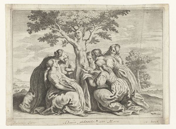 Curator: So, here we have a piece attributed to Gerard Hoet, dating sometime between 1658 and 1733. It’s titled "Mercurius beveelt de zorg van Bacchus aan de nimfen van Nysa," an engraving using pen and ink. Editor: Whew, say that five times fast! My initial reaction is...pastoral snooze fest. It looks like everyone is tired except that little cherub, who looks like he’s ready to cause some divine mischief. All those flowing garments...and is that a satyr hiding in the shadows? Gives it a creepy vibe, don't you think? Curator: Perhaps “creepy” is strong, but it's definitely got layers! This image depicts a key moment in classical mythology – Mercury, entrusting the infant Bacchus to the nymphs. We need to think about gender roles here – these nymphs become Bacchus's caregivers, highlighting themes of protection, nature, and feminine influence on a future god of wine. Editor: Wine, eh? Suddenly that drowsy nymph makes sense! It looks like the Baroque era in all its glory, trying too hard to get serious about myths, a scene crammed in a small etching. Makes one thirsty for some untamed chaos and genuine passion, something a little less… staged. Curator: Baroque art frequently employed allegory to communicate complex ideas. Think about what's absent too. What socio-political narratives can we weave out of this apparent innocuous transfer? We are looking at how power is transferred through generations, nurtured perhaps but also influenced and ultimately conditioned to lead the same way or change course! Editor: Yeah, that makes me want to give them all some coffee and some protest signs. The power structures that lie beneath what at first sight look like innocent looking drawings might show our preconceived assumptions about how society ticks. I wish it felt more revolutionary; the landscape's just too... tame. Curator: It's about perspective, no? I mean, look at it: what do you see? We need to consider that maybe the peace is deliberate, to emphasize an idyllic moment before power structures solidify again. Editor: Fair enough. I suppose even pastoral scenes can be radical when you look closely. There's always more than meets the eye, and there might be an understated rebellion within. Curator: Exactly! The beauty of art is how it allows these intersectional readings between historical understanding and personal insight. Editor: I am so enlightened it is untrue! Let's move to the next drawing – something perhaps a bit more vibrant.
