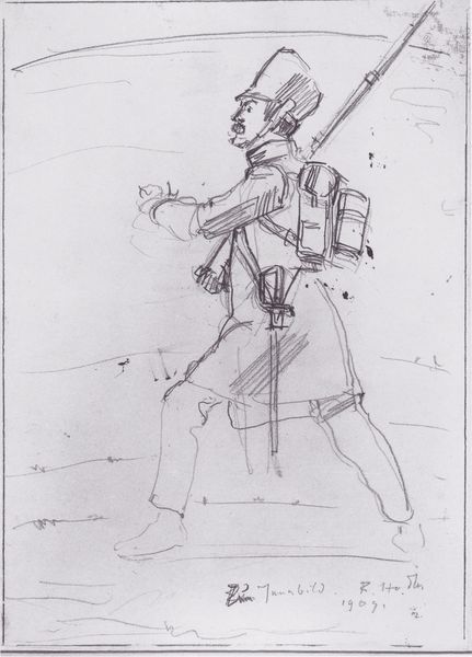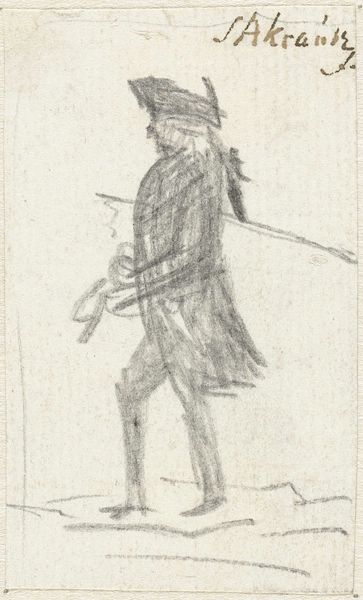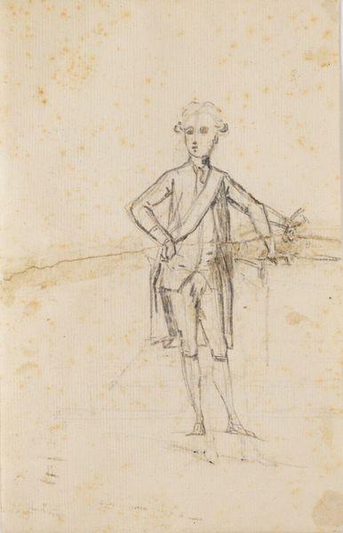 This sketch of a standing man with a hat was made by Maxime Lalanne, sometime in the 19th century. The figure emerges from delicate pencil lines on paper, with the lightness of touch and minimal shading suggesting a fleeting impression. The man's attire is loosely defined, yet the hat casts a faint shadow, indicating an interest in the play of light. The composition is structured around the verticality of the figure, balanced by the horizontal spread of the hat. The sketch favors line over mass, implying form through outline rather than volume. The transparency of the lines allows the viewer to see the construction of the image, almost like a map of the artist's thought process. Lalanne captures the essence of the figure with sparse detail, inviting us to contemplate the nature of representation itself. The drawing serves as a reminder that art’s power often lies in suggestion.