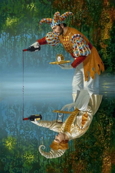 Editor: This is "Comparative Analogy II," an oil painting by Michael Cheval. It feels very dreamlike. The figure, a sort of jester, is juggling unusual objects. What draws your attention when you look at this work? Curator: Immediately, I'm struck by the material juxtapositions Cheval presents. The jester’s elaborate costume, likely machine-produced fabrics mimicking handcrafted details, is placed against organic objects - a snail, fruit, blocks perhaps carved from wood. This brings up questions about production. Consider also how the figure’s pose – seemingly effortless balance – required immense labour to achieve in reality, and consider how that resonates in relationship to artmaking and what’s considered work or skill. Editor: That's an interesting take, I wouldn't have considered it like that. Are you saying that by placing these contrasting materials together, the artist is commenting on consumerism and the value of craftsmanship? Curator: Precisely. Look closer. Even the 'natural' elements are manipulated – cubed fruit, the controlled 'dangling' electrical cords and the mask on the figure. It highlights the constant intervention humans enact on nature, often obscured by marketing that fetishizes handcraft. What labour goes into creating these "organic" objects as commodities, too? The painting foregrounds questions around how we fetishize and commodify not only art but the natural world itself. Editor: So, it's less about the symbolic meaning of each object and more about their existence as produced things? Curator: Yes, and the performance inherent in their display and our consumption. The painting challenges a simplistic view of surrealism that relies purely on symbolism by making us conscious of how these images are manufactured and circulated. Where does the power lie? Editor: This really shifts my understanding of the piece! It’s like a commentary on the system that makes art possible. Curator: Exactly. Seeing art through a material lens opens up critiques about social conditions surrounding labour and value, and our relationship to the wider capitalist structures which perpetuate them. Hopefully this insight informs our own contribution to that story!