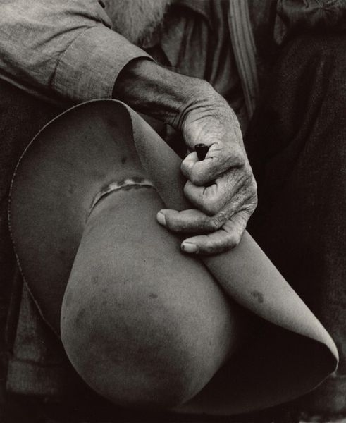 Dorothea Lange made this photograph, "Jake Jones' Hands, Gunlock County, Utah," and right away you can see it's about texture, about the real. Look at those hands. They tell a story without a single word. Lange zeroes in on the worn, leathery skin, the creases and calluses – a map of a life lived outdoors, working hard. It's all there in black and white, a stark, honest palette. The way his hand rests on the hat, it's like he's holding onto a piece of himself, or maybe a memory. It's tender, almost reverent. That single stitch on the hat. It's so small, but it brings the whole thing home. It's not just a picture of a hand and a hat. It's a portrait of resilience, and maybe a little bit of quiet pride. Lange isn't just documenting; she's revealing the soul. Her work shares a certain unflinching gaze with photographers like Walker Evans, but with a softer edge, a deep sense of empathy.