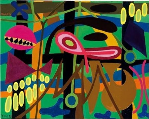 Curator: Welcome. We’re here today to explore a vivid mixed-media painting titled "Teaching." The artist is Norval Morrisseau. Editor: It feels electric! So much vibrant color, practically buzzing off the canvas. And the narrative pull—it’s got this captivating almost fairytale quality. Curator: Morrisseau is celebrated for originating the Woodland School style. Notice how the bold outlines define each form, creating these distinct visual compartments filled with equally intense colors? Semiotically, this design choice suggests clarity and containment. Editor: Absolutely. The figures appear flat, yet they possess an inner luminosity. They remind me of stained glass windows, each panel narrating its own story within the bigger picture. Is that an eagle transforming into a… teacher? Curator: That’s an interesting interpretation. Morrisseau often integrated spiritual figures like Thunderbird or, as here, related figures—depicted alongside human figures, possibly hinting at ancestral guidance. Look at how the artist orchestrates these spatial dynamics and uses strong contrasting colors to create emphasis. Editor: True, but it’s also like diving into a dream. I’m especially drawn to how he handles color – the blues fighting the yellows to exist. It creates this gorgeous, uneasy harmony. Curator: Consider how this technique reflects indigenous modes of thought, where connections between humans, animals, and the cosmos are intrinsically linked through vivid visual language and distinct colors for various spirit energies. The overall structure suggests continuity and interrelation. Editor: I love how these aren't traditional Western techniques, right? But the visual outcome can stand beside them confidently! He is really bringing traditional visual language forward into our current landscape. Curator: Certainly, and by carefully attending to both formal elements and potential interpretations, one appreciates the synthesis this painting achieves, weaving culture and artistic vision into a whole. Editor: Well, "Teaching" has definitely taught me a few new ways to look. My understanding and eye have both evolved. Curator: Precisely, it's a masterclass in symbolic articulation!