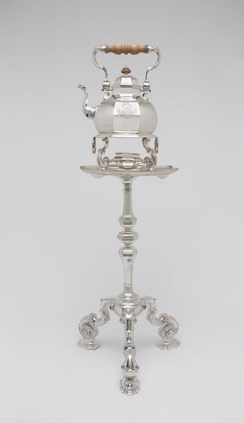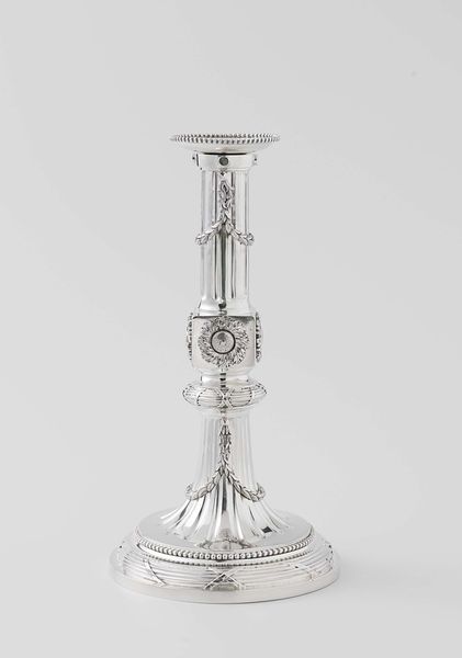 Curator: Let's turn our attention to this exquisitely crafted silver candlestick, created in 1772 by Rudolphus Sondagh. Note the hexagonal base and the lobed drip pan – the craftsmanship is remarkable. Editor: The reflective surface of the silver makes it almost ethereal. It gives off an antique mood, yet somehow also feels sturdy and reliable. It reflects so much. I wonder whose stories it held while standing guard. Curator: Its baroque influence is quite evident in the intricate detailing of the stem. The way the light catches the engraved coat of arms of Rotterdam on the base is masterful. It directs your gaze upwards. Editor: A symbol of civic power perhaps? Think of the implications – this would have illuminated spaces of importance, shaping how its commissioners understood and conveyed status within their communities. How did light function socially? Curator: Precisely. Observe how Sondagh plays with verticality, balancing the weight of the base with the delicate curves of the stem. There’s a refined elegance in its proportions. The craftsmanship enhances function with decorative technique. Editor: It feels almost like a conversation piece between faith, power, and gender, hinting at complex narratives about identity, representation and class that can be seen as subtle or obvious. How did those owning a piece like this think about such themes? Curator: An intriguing perspective. I'm drawn to its clean, yet embellished form, to its materiality and texture, particularly in relation to its composition. Its details have an elegance achieved by careful crafting. It is undeniably beautiful. Editor: Yes, beautiful but also useful to us as an object through which we might interrogate how people made meaning and identity visible centuries ago. Curator: Reflecting on the aesthetic elegance, its construction, composition, and materiality, I value this candlestick all the more. Editor: For me, this piece highlights how objects can operate as powerful historical agents through which we can now view and interpret stories, especially untold stories.