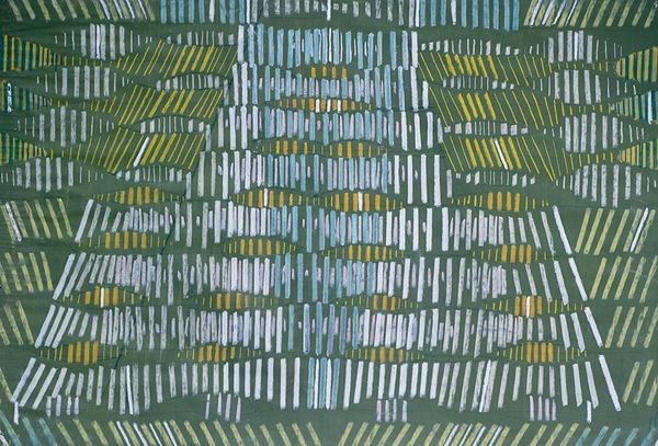 This cotton coverlet with indigo dye was produced by an anonymous maker at an unknown date. This handmade textile speaks to a rich history of domestic arts and crafts. The striking geometric pattern, created through the careful application of indigo dye, reflects both the maker's skill and the broader cultural context of textile production. The regularity of the repeating pattern indicates how the division of labor and increasing specialization impacted even domestic production. While the artist is anonymous, and its exact origins remain uncertain, historical records like trade catalogs and pattern books can shed light on the circulation of designs and techniques during the time the coverlet was made. Understanding this coverlet involves considering the social, economic, and institutional forces that shaped its creation. By studying the material culture of textiles, we gain insight into the lives and labor of the people who made and used them.