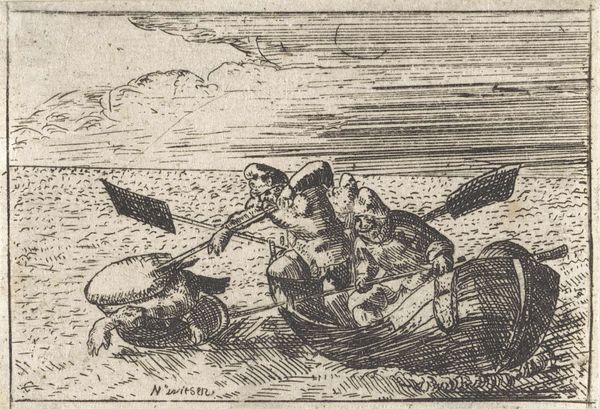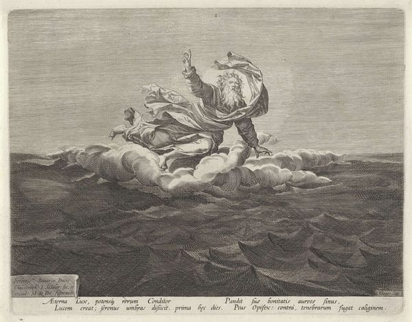 Curator: What a striking image! We are looking at "Titelprent met gevleugelde vrouw met trompet zwevend boven Frankrijk", an etching dating from between 1620 and 1664, crafted by Stefano della Bella. It's held here at the Rijksmuseum. Editor: My immediate reaction is a feeling of cool detachment. The almost clinical rendering of the landscape juxtaposed with the allegorical figure creates a fascinating tension. Curator: Indeed. Della Bella often produced prints with political undertones. This one seems to serve as a symbolic representation of France, perhaps conveying a message about the state's influence. The winged woman trumpeting could symbolize fame, or a call to arms, in a time of shifting power dynamics. Editor: Absolutely. Trumpets traditionally announce significant events. Her flowing gown and commanding posture contribute to the iconographic language of power and divine favor. It looks to me like she's actually playing a sort of a text, there's writing inscribed upon it. Curator: Good observation. This textual element gives a clue that the print may have served a specific purpose, perhaps as the frontispiece to a book. Editor: Given the artist’s tendencies and the era's inclination towards grand symbolism, I can see the Baroque elements emerging through the dramatic gestures and the sweeping sense of movement, as if she just arrived and will be on her way again. What a perfect example of art used for political display, even in printed form. Curator: Precisely. By focusing on this era through this single work of art we come to see that the lines between imagery, symbolic communication, and the very identity of a nation were constantly in play. Editor: This piece really captures the way images become cultural symbols that reverberate far beyond their initial creation. What power images wielded and in some ways continue to exercise on us today!