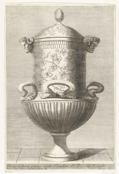 Curator: Standing before us is "Schenkkan met tuit naar links," a baroque-style etching and engraving by Jean Lepautre, likely created between 1648 and 1655. Editor: My immediate reaction? It feels a bit... theatrical. The way the light catches the curves and that serpentine handle makes me think of operatic drama. Curator: Lepautre was known for his ornamental designs, and this pitcher, while a functional object in theory, is really a demonstration of skill. Consider the lines, the way he creates depth simply through hatching. And notice the material possibilities: metal transformed through skilled labor. Editor: I’m particularly drawn to the texture he creates. The scaled pattern on the main body of the pitcher, contrasted with the smooth upper portion and that intricate lip. It's a real play with form. And let’s not forget the handle – a dragon, a symbol often associated with power and transformation! Curator: The fact that Lepautre circulated his designs as prints had a huge impact. It allowed these elaborate patterns to be reproduced easily by other artisans, enabling them to create similar items with, perhaps, more rudimentary methods. Editor: But is it not also fair to examine the way in which an image of luxury participates in creating its perceived value, divorced from material context, encouraging, enabling consumerist desire for even a simpler copy? Also, look closely; do we notice symmetry at play in this pitcher? It certainly emphasizes balance and classicism. Curator: Interesting. It pushes the concept beyond a unique, precious artwork and connects it with production, class and social structures of Baroque society. One must always contextualize to consider the socioeconomic implications of such art, for maker and consumer alike. Editor: Yes, and from my view, looking at structure, color and materiality can offer insight to symbolic or even emotional responses, it opens another valid avenue of discussion, don't you think? Curator: Indeed, this etching offers various views of examining and understanding Baroque artwork; I appreciate noticing your initial thoughts and insights on the dragon handle. Editor: Well, thanks!