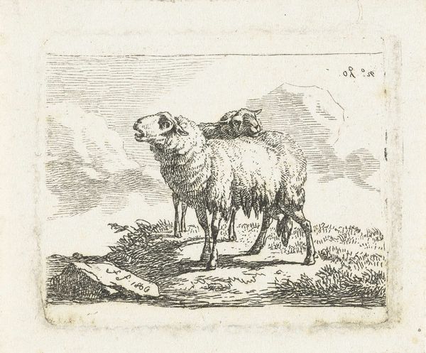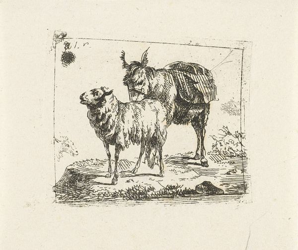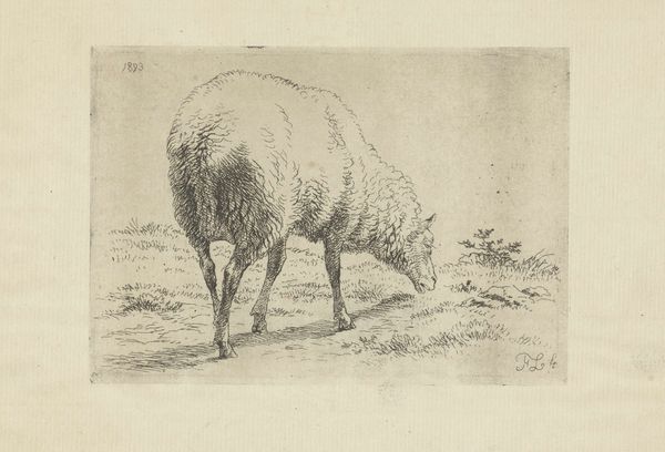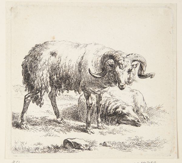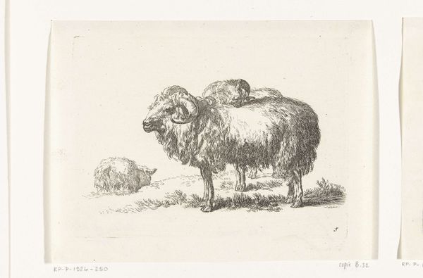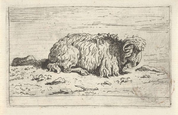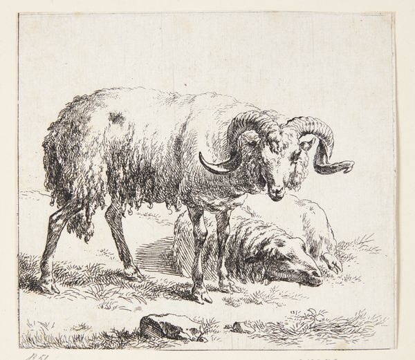 Curator: We're looking at an etching from the Dutch Golden Age. It's called "Ram" and was created sometime between 1655 and 1688 by Govert van der Leeuw. Editor: My first impression is one of intense detail; the textures practically jump off the paper! You can almost feel the thickness of the ram's wool just from the intricate use of lines. Curator: Indeed. Van der Leeuw's work appeared at a time when Dutch art shifted from religious iconography towards secular, everyday subjects. Rural life and animals held particular fascination, reflecting the economic and social importance of agriculture. Prints such as this became accessible commodities in the burgeoning art market. Editor: The composition is so deliberate, leading the eye to trace the animal's form. The play of light and shadow really emphasizes the mass of the body, creating an imposing yet dignified presence. Curator: Considering this, prints like "Ram" helped solidify a national identity linked to pastoral prosperity. Sheep farming in particular was a massive economic driver at the time. So, we see something as seemingly simple as an etching carrying subtle messages of Dutch affluence and social harmony. Editor: Looking at the ram’s posture, there’s also a dynamic contrast between strength and serenity. Notice how the solid body and textured fleece meet more delicately articulated features like the horns and head; its placement on the slightly angled plane gives it more life. Curator: I agree. Prints were displayed not only for decoration but as emblems of societal values. They promoted and upheld particular social narratives that would appeal to various viewers and were accessible. Editor: I can certainly appreciate the socio-economic aspects you point out. However, from an artistic viewpoint, it remains fascinating as a beautiful rendering in itself. Van der Leeuw managed to convey a wealth of information using only lines and shading. Curator: It makes you realize how much even seemingly simple works were integrated with, and were reflections of, contemporary society. Editor: Exactly. Now I look at it not just as a nice etching but as a small piece of that moment in history made manifest.