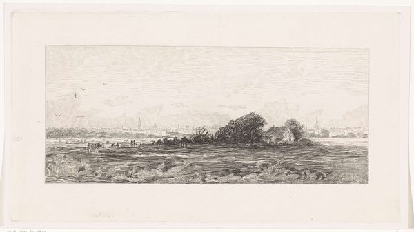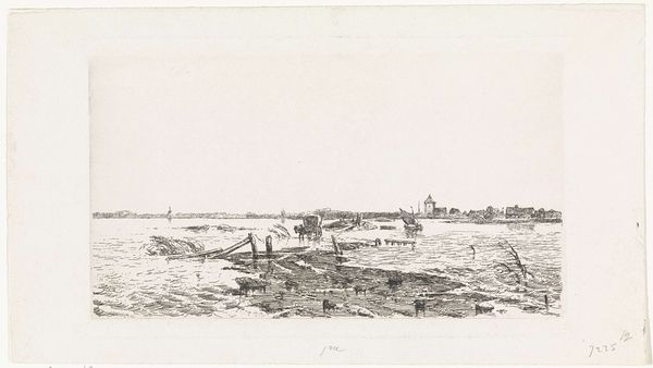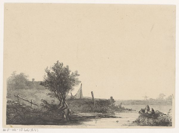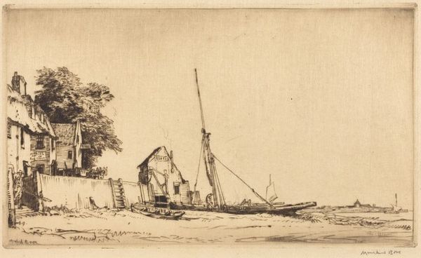 Curator: Before us is Muirhead Bone's "The Ypres Tower, Rye," an etching created in 1909. Editor: It has such a stark, wistful atmosphere. The tower looms, yet feels distant somehow, softened by the technique, perhaps. Curator: Absolutely. Bone was a master of etching, capturing a scene’s essence with minimal lines. We see here a convergence of landscape and cityscape themes common at the time. It highlights how cities and towns are defined by, and built upon, the very ground they occupy. Think about the tower as a signifier of civic power, of dominion. Editor: For me, the way Bone handles the medium itself is key. Notice the density of the lines in the foreground – seemingly scratched into the plate with intention. It gives a tactile quality that speaks volumes about labor. He almost relishes the materiality. Are we meant to consider how it feels to live here as much as simply view the scene? Curator: I'd suggest that Bone is very conscious of the Ypres Tower's significance as a historical site, and I agree that it has everything to do with the landscape and how people actually experienced being here. These towers speak to a place’s heritage, its layered histories… This wasn’t a mere snapshot but a carefully composed reflection of place. The etching revives a collective understanding of the town’s history in a single view. Editor: Perhaps a touch sentimental then, because you can almost feel the grit between your fingers through the ink on the page. It reminds us how integral materials are. Etching wasn’t a pristine process – each plate tells its own story of wear and creation. How many of these were printed, sold, consumed? Each print has its own life. Curator: The image resonates powerfully within the British tradition of topographical art, popularised and propagated in no small way by its dissemination via the medium of print. But I wonder – did Bone intend this piece to glorify this site or something else? I think the image can be appreciated even without knowing the history of the depicted locale. Editor: Fair enough, and maybe it shows me there's still much to explore beneath the surface in terms of the production history, of labour, materiality, and ultimately consumption here. Curator: An insight that, I think, reveals a richer understanding of the place that Bone brought to our attention today.