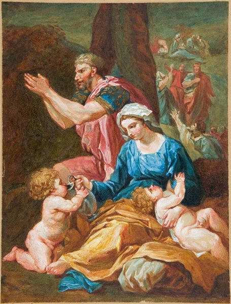 Curator: Sebastiano Conca's oil painting "Holy Family with St Anne, the Baptist and Zacharias" depicts a multigenerational scene steeped in religious history. Editor: The first thing that strikes me is the almost exaggerated softness. The figures seem to blend into each other, a flowing unity achieved through these diffused brushstrokes and delicate coloring. Curator: This blending resonates with the underlying theme of familial continuity. The composition suggests an interweaving of lives and legacies across generations. Note the cherubic figures, particularly the child in the upper part of the scene. It directs our eyes upward. Editor: Right, it really captures your gaze. From a craft perspective, this emphasis could indicate a painting primarily intended for altarpieces as it emphasizes perspective from a floor level point of view. Look at the drape of the textiles too, as it certainly lends to a luxurious feeling and an elevated scene. Curator: Precisely, the cherub could even be interpreted as representing divine oversight, a spiritual promise inherent in this familial lineage. And while Conca painted in the Baroque style, one also detects influences from the Italian Renaissance, visible in its formal approach and delicate coloring. What would this work evoke to an early eighteenth century viewer? Editor: The consumption of imported oil and pigment was significant! Perhaps this served as visual language for both wealth and spiritual currency in society, both embodied in this singular artwork. I mean look at this, there is just no mistaking it’s luxury through visual excess. Curator: Indeed. I also sense a subtle melancholic atmosphere despite the gathering of the family, perhaps foreshadowing the trials and tribulations faced by the individuals portrayed. The artwork then becomes less an idealized family portrait, and more about divine fortitude, as suggested through all those elements that you mention! Editor: Well, whether it’s melancholic or gilded excess is perhaps down to the beholder. Conca has presented a richly suggestive piece, offering various entry points from material engagement, historical influences and art appreciation, and into visual storytelling. Curator: Absolutely, there are countless other readings possible. I'm sure visitors will derive their own nuanced and unique interpretations from its depiction of spiritual ideals.