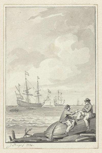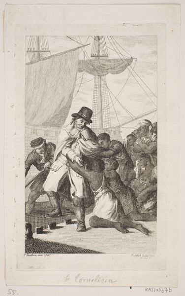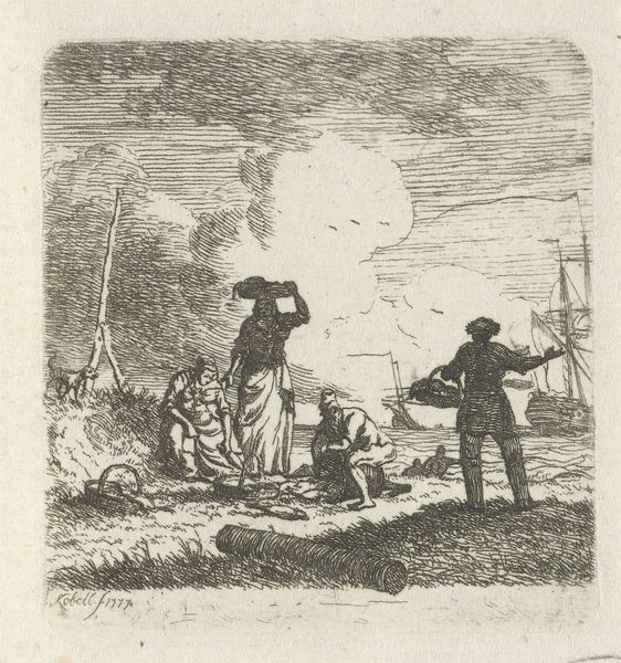 Francisco de Goya made this etching, titled ‘Muchachos al avío,’ using metal, acid, and ink. Goya was a master of the printmaking medium. The aquatint technique he employs here involves exposing a copper plate to acid, creating a tonal effect. We can see this in the areas of shadow and depth, achieved by varying the duration and concentration of the acid. Goya's skill lies in his manipulation of these materials to create a range of textures, from the rough fabric of the men's clothing to the smooth surface of their skin. The image captures a scene of apparent leisure, yet the figures' expressions and the sharp knife suggest an underlying tension. By focusing on the materiality and process of this print, we can appreciate how Goya elevated a relatively common medium to a powerful form of social commentary.