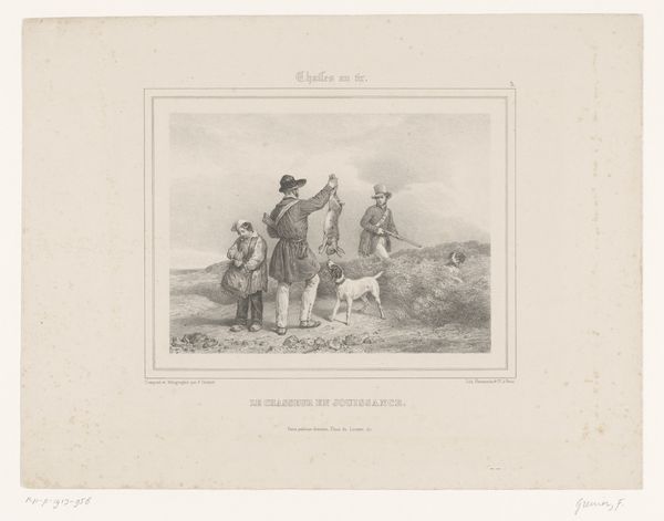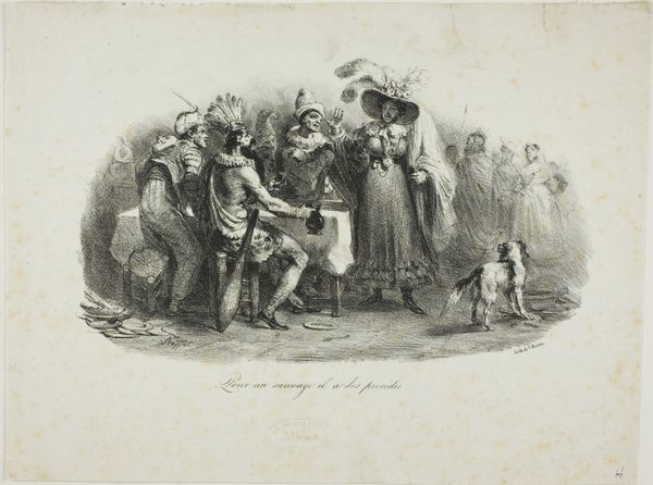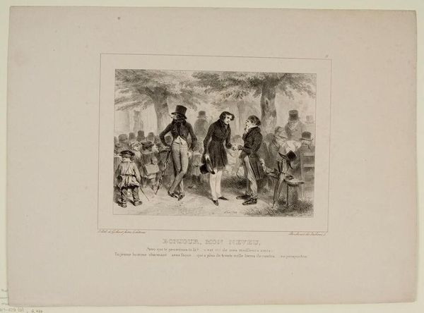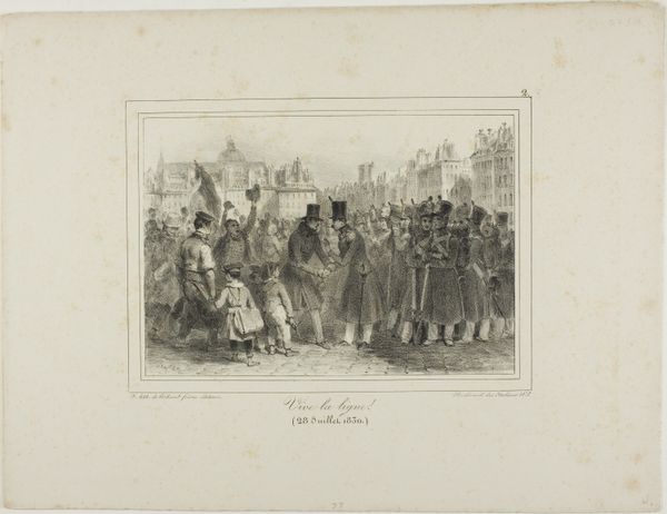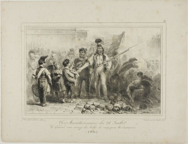 Curator: What catches my eye first in this lithograph by Auguste Raffet, created in 1831 and titled "Je n'tire pas! Si la cause était bonne, y n'faudrait pas d'argent pour la défendre. 28 Juillet 1830," is the immediate sense of drama—of conflict arrested, maybe even transcended? It’s quite striking. Editor: Drama, certainly, but it's staged. Raffet freezes a moment loaded with political implications. Look at the title – "I won't shoot! If the cause were just, it wouldn't need money to defend it." That links the depicted moment directly to the July Revolution, critiquing power and its potential for corruption. Curator: Yes, there’s an inherent critique, but I see a larger commentary on revolution and integrity. Those rigid lines of soldiers and then, this officer seemingly mediating? He’s a fulcrum of doubt. And the vulnerable figure next to him seems to personify the revolution's promise being bartered away. Editor: I read that figure not as vulnerability but as complicity. That suited civilian amidst the military underscores how revolutions are always co-opted. It speaks to how systems of power rarely fundamentally shift, they just reshuffle personnel. Also, note the contrast between the almost caricatured common soldiers with their weaponry and the other two. It highlights class disparities in a time of supposed national unity. Curator: Maybe… or maybe that tension makes a compelling case for what could have been; what *should* have been. He renders their human spirit so poignantly – that single figure refusing the act of violence; its so hopeful even if ironically stated! I sense yearning within those strong Romantic lines and figuration. Editor: "Hopeful?" I think you're being generous! For me it evokes disappointment and cynicism, because these scenes were so easily replicated during periods of unrest. Even if there’s initial idealism, power always corrupts, whether the artist explicitly depicts or only implicitly foreshadows. Its reproduction as a print only extends the availability to be reminded. It is as if the artist implies our actions have been pre-determined, replayed over centuries in similar form. Curator: Well, to me the figures seem almost defiant. Despite everything, the spirit of true change remains, however frail. Editor: Perhaps it is not a binary option; the artwork encapsulates disillusionment but invites us to consider resisting cyclical histories of betrayal.