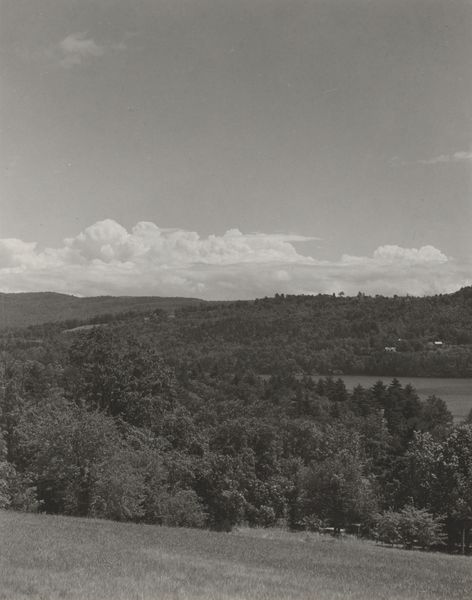 Curator: Let's turn our attention to this serene landscape photograph entitled "Rainbow," taken in 1920 by Alfred Stieglitz. What's your initial take on it? Editor: The composition strikes me immediately. The dominant diagonal of the "rainbow," almost more like a shaft of light, cleaves the image. The gradation of tones, particularly in the sky, creates a palpable sense of depth. Curator: Stieglitz was a major force in advocating for photography as a fine art. In his landscapes, especially, he sought to elevate photography to the level of painting through careful composition and printing techniques. "Rainbow," realized as a gelatin silver print, encapsulates that ambition. Editor: It is also clearly tonal and, dare I say it, moody. While it lacks the chromatic brilliance suggested by its title, the grayscale palette amplifies the atmospheric effect. The eye is drawn upward from the dark treeline to the illuminated sky. Curator: Consider the socio-political context too. During the early 20th century, debates raged about photography’s status as art. Figures like Stieglitz worked tirelessly through exhibitions and publications to legitimize photography, imbuing images with a romantic and almost spiritual aura to suggest profound emotional experience, very much in keeping with that moment’s artistic trends. Editor: Indeed, that romantic leaning manifests in the almost ethereal quality of light and shadow, reinforcing that diagonal as not merely a structural element, but as a focal point through which all the romantic sentiments condense and find expression. It feels charged, this stark light and dark division. Curator: What I find most compelling is the ambiguity, or perhaps better understood as the range of experiences presented, in rendering a seemingly straightforward subject, like a landscape or indeed, a rainbow. Stieglitz infuses it with cultural meaning and historical weight that makes it far more significant than merely documentation. It acts as an exploration of light itself. Editor: I am also moved by the way it draws a viewer’s focus to light’s very capacity for transformation. The rainbow itself feels both present, through implied form and the symbolic, and is allusive: like our perception of rainbows it also alludes to larger concepts like illusion and transience. Overall, it's hard to not be captured by this dynamic between form and emotion, light, and subject, to not also reflect a bit more deeply about their presence or fleeting nature. Curator: It encourages us to see beyond the surface, connecting with something larger than ourselves, both through visual form and historical context. Editor: Exactly, a harmonious dialogue that amplifies both the form and impact this photograph evokes and still presents to viewers today.