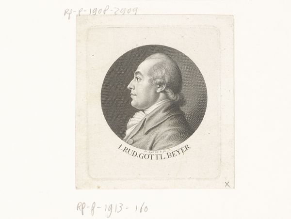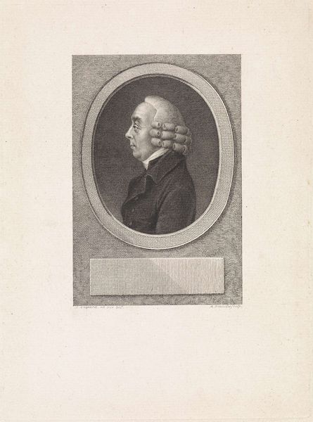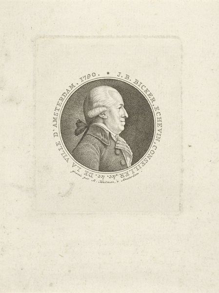 Editor: So here we have a print titled "Portret van Jan Bernd Bicker, op 44-jarige leeftijd," dating back to 1792, by François Joseph (I) Pfeiffer. It looks like an etching or engraving. It feels so formal, almost like an official document. What's your take on this, coming from a historical perspective? Curator: The formality is definitely intentional. Prints like this circulated widely in the late 18th century and played a key role in constructing and disseminating images of power and status. Consider the context: the rise of a mercantile elite in the Netherlands, and the growing emphasis on individual achievement and public virtue. Editor: So, this wasn't just about documenting what Jan Bernd Bicker looked like. Curator: Exactly. Think about how Bicker is presented: in profile, a format associated with Roman emperors, with inscriptions proclaiming his age. These weren't objective likenesses but carefully crafted representations that spoke to specific social and political ideals. Who controlled the narrative? Who commissioned and consumed images like this? What was Bicker’s position in society at that time? Editor: That makes sense. So the print functions almost as a form of social media of the time, building Bicker's brand, perhaps? Curator: Precisely! The portrait itself also has a symbolic charge. Details like his wig and attire would have signaled his position within a specific social hierarchy. It highlights the artist's etching skill but also subtly enforces societal power dynamics. Editor: I hadn't considered the image as constructing a social position. It's fascinating how much an image like this could communicate beyond just physical appearance. Thanks for helping me see this print within its historical framework. Curator: My pleasure! Understanding these prints requires decoding their visual language and understanding the socio-political climate in which they were created and circulated.