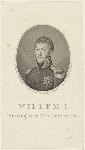 Editor: So, here we have "Portret van Willem I Frederik, koning der Nederlanden," from 1814, by Jacob Ernst Marcus. It's an engraving, and the detail is quite striking, especially the uniform. What story do you think it tells? Curator: Well, this print isn't just about Willem Frederik. It's deeply connected to the political climate of the Netherlands at the time. Consider its creation date: 1814. Napoleon had just been defeated, and there was a powerful desire to re-establish a sense of national identity and legitimacy, including ideas tied to nationalism and patriotism. Editor: Right, the end of French rule. So, the portrait is a statement? Curator: Precisely! These portraits of leaders served to legitimize their rule and project a certain image. Notice his stern gaze and the opulent uniform? These details project power and authority. But let's think about where this image would have been seen and consumed at the time, for example. How do you think its circulation influenced the public perception of the monarchy? Editor: I imagine prints like these would have been quite accessible, circulating widely among different social classes. So, the image becomes a powerful tool for shaping public opinion, maybe even forging a sense of unity after a period of upheaval. Curator: Exactly. The image works to solidify Willem Frederik’s image and the role of the monarchy as stable and enduring in this new socio-political moment. Now, I’m wondering, with the distance of time and a different societal lens, how we respond to that representation of power and identity. Does it still resonate? Editor: I see him less as an imposing figure and more as a relic of a particular moment in history, a visual record of a power play. It highlights the construction of identity for political ends. Curator: That’s a valuable observation. Understanding the context really changes how we see it. It ceases to be a simple picture and becomes a window into history and politics. Editor: Definitely gives me a lot to think about, understanding that even seemingly simple portraits like these had profound impacts on society. Curator: Absolutely, and that's why analyzing art through the lens of history and society is so essential.