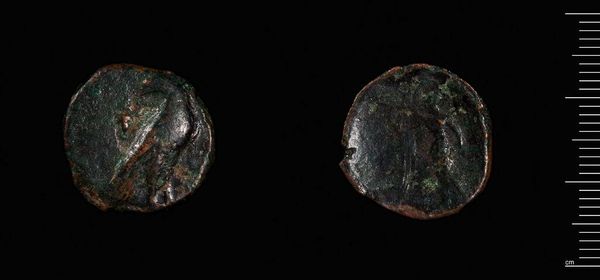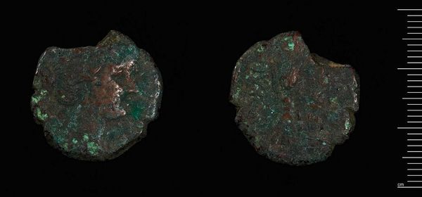 Curator: This is a bronze coin created by Agathokles, Tyrant of Syracuse. Editor: It looks ancient, really ancient. The green patina speaks of time and transformation. I feel the weight of history just looking at it. Curator: Coins like these weren't just currency; they were statements. Consider the symbolism—the portrait of the ruler, or perhaps a deity, on one side and the bull on the other. Each motif carefully chosen for its cultural associations. Editor: Absolutely. The bull, especially, likely signifies power and wealth in that agrarian society. But I also wonder about who had access to these symbols. Did this imagery reinforce existing hierarchies, or did it communicate more broadly about Syracusan identity? Curator: It's a fascinating window into the past. It helps us visualize their values and power structures through visual imagery. Editor: Yes, definitely. This little coin prompts us to think about much larger systems of power.