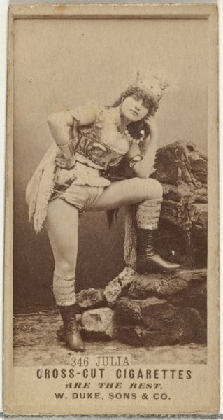 Curator: This is “Miss Summerville, from the Actresses series (N203)” issued by Wm. S. Kimball & Co. in 1889. It’s currently part of the Metropolitan Museum of Art's collection here in New York. Editor: Oh, fascinating! At first glance, the theatricality of it strikes me. Her pose is so staged, the fringe shimmering, the sword… rather unwieldy looking, don’t you think? Curator: Indeed. The "Actresses" series, a set of trade cards distributed with Kimball cigarettes, were incredibly popular. They provide a snapshot of the public image of women in entertainment and consumer culture during that period. This wasn't about high art; it was about circulation, advertisement, and constructing celebrity. Editor: So, mass production meets stage performance? I find myself wondering about the materiality of the card itself—the paper stock, the ink, the printing process. These weren't meant to last; they were ephemera. And yet, here we are, analyzing their layered meaning. What statements can we gather around its commercial intentions, its impact and accessibility to audiences? Curator: Exactly. They were deliberately ephemeral, but they became intensely collectable. Consider the performance here, Miss Summerville embodying a specific persona that blends femininity and power, note how she dominates the pictorial space by positioning one leg in the corner column while resting the other on it, giving a powerful statement for a delicate art-piece. Editor: Absolutely, and in her adornments, she shows the means of theatrical representation, an object created with low-quality and cheap items trying to imitate better materials like the shiny garments to resemble golden or silver apparels, that she’s selling her power. Curator: It speaks to the broader social fascination with actresses at the time. The theater held significant social importance as well as commercial importance, both are tightly connected at the time. Editor: Precisely. By situating this image within its original context – cigarette packaging – we start to understand how celebrity imagery circulated within commercial and social realms. What a lens for thinking about representation! Curator: A fascinating dance between intention and reception indeed! I'll never look at a cigarette card the same way. Editor: It's a reminder that even seemingly disposable objects have lasting stories woven into their making. A history materialized in our hands.