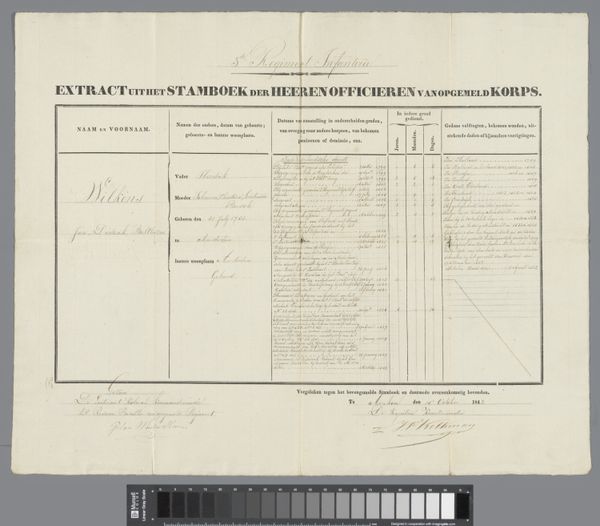 This 'Indelingsstaat van de Vrijwillige Jagers van Utrechtsche Hogeschool', or 'Classification List of the Volunteer Hunters of Utrecht University', was printed in 1831 by H. Eskuchen. It meticulously lists the names of students enrolled in the University's volunteer military corps. Created during a tumultuous period in Dutch history, it reflects the social and political climate following the Belgian Revolution of 1830, when the Southern provinces seceded from the United Kingdom of the Netherlands. The detailed categorization of students into pelotons, sections, and escouades indicates a society deeply concerned with order and defense. Universities at this time were closely tied to the state, and student corps like this one served as a reserve force. Examining enrollment records and university archives can reveal the social backgrounds of these student soldiers and shed light on the role of academic institutions in shaping national identity and military preparedness. The image then isn't just a list, it's a snapshot of a nation on edge, mobilizing its youth.