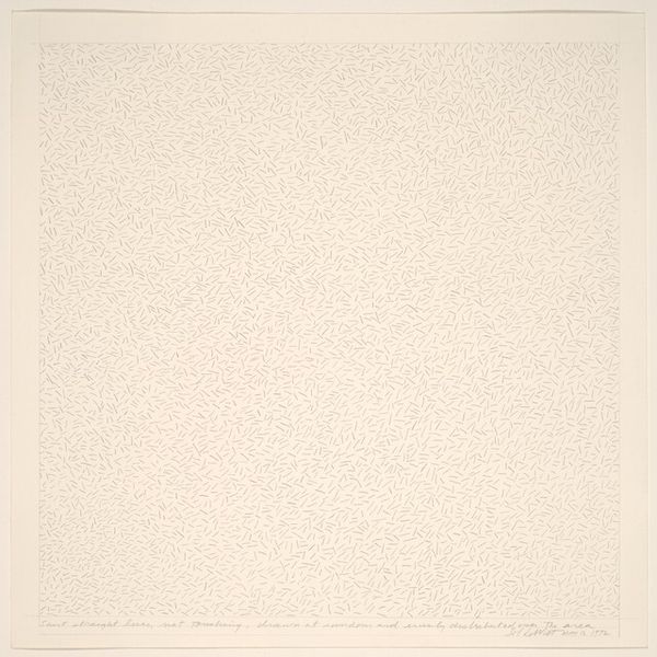 Curator: Elinor Roberts’ piece, "Dunham Hill (5)", presents a fascinating study in monochrome and texture through the medium of graphite drawing. Editor: Whoa, my first thought? It’s like staring into a really still, graphite-colored lake on a cloudy day. Deep, somehow infinite, and maybe a bit… melancholy? Curator: I appreciate that immediate response. This work can be understood within the context of Abstract Expressionism, where the focus shifts away from representational form to an exploration of materials, gesture, and surface. Editor: That’s right—you lose any need for narrative. And I notice now, up close, it's an absolute obsessive latticework, millions of tiny lines all going every which way, right? You can see the hand labor that’s there. Curator: Precisely, there is a sense of repetitive action, a deliberate and potentially meditative process by Roberts in building this surface. Editor: Makes me wonder if there were a limited number of these works created due to the painstaking labor required. If so, that affects my view of it further! It almost gives a spiritual sense with its quiet complexity, maybe with an awareness of a universal structure, too. Is that a reach? Curator: Not at all, and it highlights the impact artistic production has on distribution and consumption. If it had been a commercial painting, how different the artwork's message or appeal might have become. We often overlook the societal implications in the simplicity of Abstract Art. Editor: A lesson that context shifts our art consumption entirely! The object may not speak alone! Curator: Exactly. And from a more material point of view, looking at art objects with knowledge like this offers one potential, though limited, glimpse at culture itself. It’s like having a very, very muted conversation with the world. Editor: It might be quiet, but like this drawing shows, the depth is immense. It’s a great example that there's so much to unpack in what appears so straightforward initially.