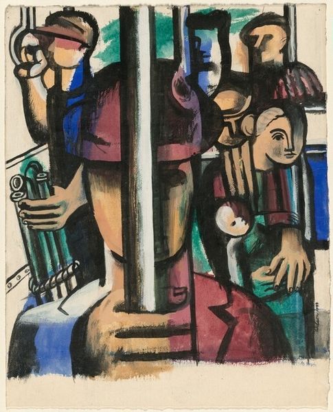 Curator: This is Pablo Picasso's "Two Figures," painted in 1934. It’s oil on canvas. Editor: Well, hello there, Picasso. What a hot-blooded mess. Makes me think of overheated arguments and passionate reconciliations, all smeared across the canvas. Curator: Precisely. The work itself can be interpreted as a conversation through the use of distorted forms, jarring colors, and overlapping planes. It seems to reflect a dialogue of figures, styles, and emotional states. The visible brushstrokes and vibrant color choices highlight Picasso's physical engagement with the materials, drawing attention to the labour-intensive process of production. Editor: The one figure is kissing another figure and the green of the other one figure’s face kind of scares me, even with the little flowers. Like, “Get out of here or I will end you!” I mean that other figure is scary too, with the dark black line making me think of the black of tar, it scares me. Curator: It is fascinating how the application of bold outlines contributes to a flattened pictorial space, almost like paper cut-outs arranged on the picture plane. The setting has an impact also as it does highlight the spatial ambiguity characteristic of cubism. This suggests a departure from traditional perspective and a move toward abstraction in response to broader societal and economic shifts. Editor: Yeah, those big geometric shapes make me think about life and how it does that to you, with all of these planes coming from different directions to knock you sideways. If he wanted to show off on some surface of experience then he’s done it, though, yikes. He has really let the medium itself come to life through the subject here. Curator: Absolutely. He masterfully employed readily accessible and rather industrial oil paints, elevating them through a combination of unique painterly techniques to a level we might associate with high art. It bridges this work from that perceived gap that so many have laboured over across the centuries. It also makes me wonder, you know, like, what’s “low art”? Editor: Right? Everything has heart, including this Picasso. In a bizarre, kinda scary, but compelling way. Curator: Indeed. Food for thought on production, intimacy, and passion laid bare!