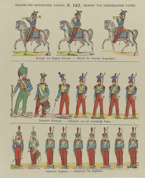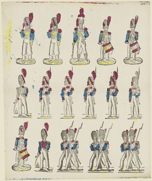 Philippus Jacobus Brepols created this print called "Togt der infanterie / Infanterie en marche" whose date is unknown with etching. Notice how the figures are organized into neat rows and columns. This creates a sense of order and uniformity, typical of military formations. The use of color is strategic, with each row distinguished by a different color scheme—reds, yellows, and blues. This may not only represent different units but also serve a structural purpose, guiding the viewer's eye across the composition. Brepols uses line to delineate the uniforms and weaponry, providing a precise depiction of each soldier's attire and equipment. The lack of depth flattens the image, turning it into a pattern rather than a realistic scene. This flatness emphasizes the print's surface and its nature as a constructed representation. The rigid arrangement suggests a semiotic system, where each element—uniform, weapon, color—functions as a sign. It is open to ongoing interpretation, inviting us to reflect on the interplay between representation and reality.