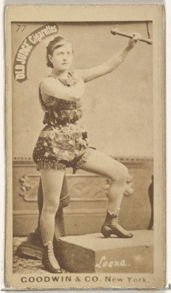 This small card was made in New York by Goodwin & Company, sometime in the late 19th century. It is a photographic print, one of many inserted in packs of Old Judge Cigarettes. The card's materiality speaks volumes. It's a mass-produced object, designed to be collected and traded. The photographic image, likely captured using a collodion process involving a glass negative, captures a Parisian actress, Mlle. Courvalet. The sepia tones and slight blurriness of the photograph give it a sense of nostalgia and distance. This was a time when photography was becoming increasingly accessible, but was still seen as somewhat magical. What interests me most is how this card reveals the intersection of entertainment, advertising, and industrial production. The image of Mlle. Courvalet, a performer, is used to sell cigarettes, a product increasingly associated with leisure and pleasure. The card itself is a small, inexpensive object, yet it represents a complex network of labor, capital, and desire. It challenges our notions of fine art, as it exists within a broader history of commercial imagery and popular culture.