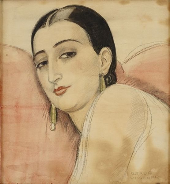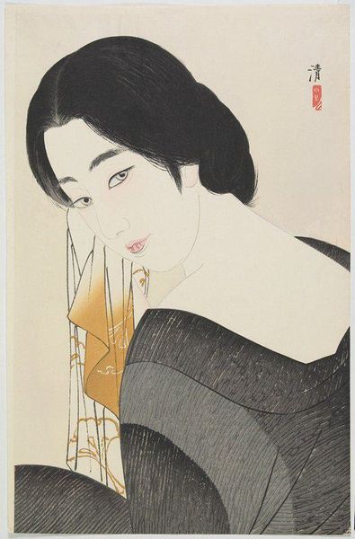 Curator: Paul Jacoulet’s 1935 woodblock print, “Beaute Japonaise Moderne. Kobe,” immediately gives the impression of understated elegance. Editor: Absolutely, there's a delicate refinement to this piece. The pastel colors and soft lines contribute to a serene and almost dreamlike atmosphere. The sitter's enigmatic expression seems to draw the viewer in. Curator: Indeed, but Jacoulet, a Frenchman, working in Japan, occupied a fascinating position. His work embodies a studied "Orientalism," blending Western artistic sensibilities with the traditions of Japanese Ukiyo-e prints. We should consider how the West imagined and represented Japan. Editor: And this piece reflects that very sentiment. The woman's clothing feels contemporary for the 1930s, but there is the classical simplicity reminiscent of earlier Ukiyo-e subjects. The sharp line work of the face creates a focus for a central emotion that holds the eye of the viewer. Curator: What's particularly fascinating is the use of this very modern subject rendered using very traditional methods. He embraced the collaborative process, working closely with skilled Japanese carvers and printers, to ensure his vision translated faithfully into the woodblock medium. It challenges any simplistic notion of "East meets West", and opens an interpretive conversation about authenticity. Editor: Speaking to that complexity, the woman’s face seems very individualized. And while stylized, there’s also something intimate, almost voyeuristic. The viewer is invited into a world that is simultaneously modern and rooted in centuries-old print-making processes. Do you think she is aware of her audience, the implied spectator? Curator: I am not sure she acknowledges that implication at all. But, thinking historically, the artist himself occupied that liminal position of insider-outsider. And how these "in-between" identities manifest within the visual and material culture are often overlooked. Editor: Exactly, and in that interplay between identity, perspective, and representation lies the compelling mystery that resonates. A subtle cultural artifact from a particular point in time, viewed with multiple lenses that give rise to contemporary appreciation. Curator: So many interesting complexities to be found in a deceptively simple print.
