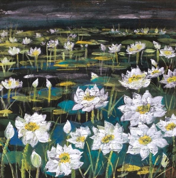 Theodore Wores painted these lotus flowers in Tokyo with oil on canvas. The lotus isn't merely a beautiful flower; it's a profound symbol of purity, rebirth, and spiritual awakening, deeply rooted in Eastern religions and philosophies. Think back to ancient Egypt, where the lotus represented creation and resurrection, mirroring the sun's daily cycle. This symbolism traveled eastward, embedding itself in Buddhist thought, where the lotus blooming from muddy waters signifies the journey from darkness to enlightenment. Notice how the lotus emerges, pristine, from the murky pond? It echoes the soul's potential to rise above earthly attachments. It's a potent image, engaging our subconscious with themes of transformation and transcendence. The echoes of this symbol reverberate through time, appearing in various forms, from religious art to modern motifs. The lotus, in its cyclical blooming, reminds us of the enduring power of symbols to carry cultural memory, constantly resurfacing in our collective consciousness.
