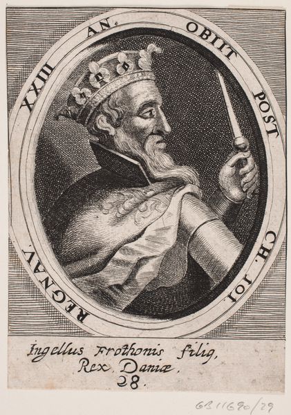 Curator: So, here we have an engraving titled "Fridlev den Rappe" dating back to 1646. This piece, housed at the SMK in Copenhagen, presents us with a portrait within an oval frame. It seems to want to present something about Danish history. Editor: Right away, I get a feeling of solemnity from this portrait. There's a sternness in the subject's expression, a quiet intensity in the detail work of the lines that carve out his features. It's interesting that an anonymous artist captured this image; does this anonymity allow greater focus on Fridlev and what he stood for, less distraction about who captured him? Curator: Precisely. Engravings like this one served to memorialize historical figures. What fascinates me are the attributes that come along with that choice – his cloak, sword, and the crown-like turban. Consider the cultural weight such images bore: connecting Fridlev, or Fridlevus as the inscription notes in Latin, with a certain understanding of power and legacy, spanning Dania, Britannia and Hibernia. These aren't simple drawings but curated stories of a reign and a heritage. Editor: It makes you wonder about the choice to depict him in profile too, doesn’t it? There is a classic and authoritative visual quality that reinforces those notions of rulership and succession you mention. The way the artist uses simple cross-hatching, just really detailed in specific spots, makes it feel very accessible, less about divine right, and more a human endeavor, if that makes sense? Like, power is portrayed, but it feels more earned than ordained, you know? Curator: I understand. The portrait is also enclosed by lettering, it emphasizes time and reign: "XXXVII AN. REGNAV", marking the length of his reign and, conversely, "OBIIT AN. CH. 30", notes the year of his passing, rooting his narrative in the timeline. Such detail underscores the print's intention, a pedagogical and memorial tool, a tangible means of cultural continuity. Editor: A continuity created by an artist in very thoughtful way, using pretty economic strokes to deliver an understanding of time, place, and power, which now echoes for us through the centuries. It is also simply very appealing! Curator: Absolutely. An eloquent summary. This glimpse into history offers insights into how we construct and perpetuate our cultural memories. Editor: It prompts one to wonder, who might we engrave today? What story of power would *we* tell?