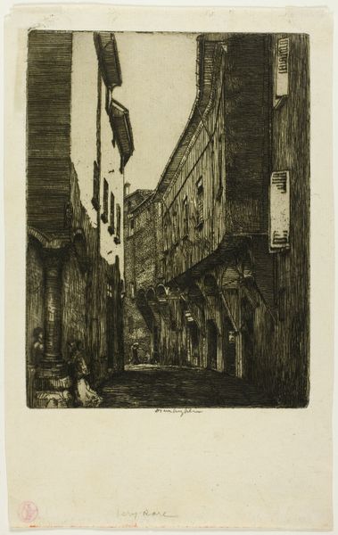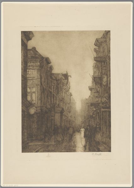 Willem Adrianus Grondhout created this etching, titled "Ulm," by using a metal plate, likely copper or zinc, to create this image. He would have coated the plate with a waxy, acid-resistant substance, then scratched away lines to reveal the metal underneath. Immersing the plate in acid would then bite into these exposed lines, creating grooves that hold ink. Grondhout then wiped ink across the plate, forcing it into the etched lines, and wiped the surface clean. When pressed against paper, the ink transfers, resulting in a print with fine, delicate lines. This process allows for the creation of multiple impressions, making the artwork accessible to a wider audience. The choice of etching as a medium speaks to its capacity for detailed line work, suited to capturing the architectural nuances of Ulm. The labor-intensive nature of etching contrasts with the industrial subject matter, highlighting the tension between handcraft and the burgeoning urban landscape of the time. It's a beautiful balance between material, making, and context.