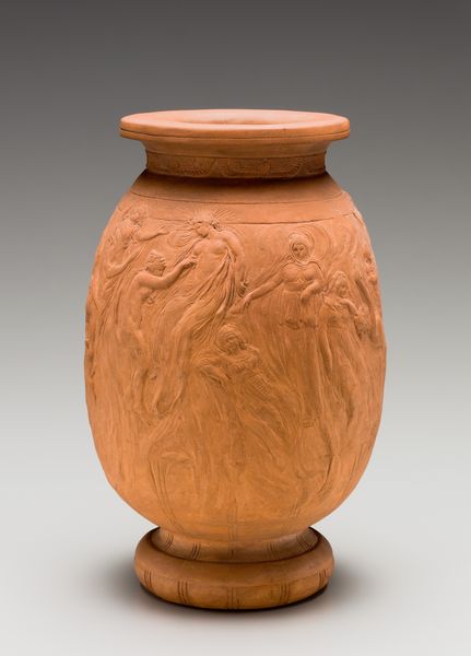 Editor: Here we have the "Lebes gamikos," dating back to 430 BC. It's crafted from earthenware, a form of ceramic, and resides at the Metropolitan Museum of Art. I'm immediately drawn to its vessel-like appearance and classical figures decorating its form. What do you see in this piece? Curator: Well, I see more than just earthenware and a vase. I imagine the hands that shaped this clay, the families who gathered around this object during marriage ceremonies, their hopes and anxieties swirling around its form. A "lebes gamikos" was traditionally used in ancient Greek wedding rituals, specifically to hold the bathwater for the bride before the ceremony, so water within its shape represents purity and cleansing, wouldn't you agree? What kind of stories could this pot tell, do you think? Editor: That's beautiful! Thinking about it containing bathwater makes it so much more personal. It seems a simple shape, but incredibly profound. Considering its intended purpose, how did its use contribute to our understanding of marriage within that culture? Curator: It underscores the importance of ritual and tradition in ancient Greek society. The *lebes gamikos* wasn't merely functional, it was a symbolic vessel containing blessings and well wishes. Can you imagine the conversations around it? Editor: I love how an everyday object can give us a glimpse into history, a look into a specific ancient ritual. Curator: It’s almost as if time becomes more transparent with each layer of paint or firing on that clay! Editor: Exactly! There's a whole story living in it, that just comes alive as we look closely.