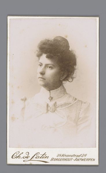 Curator: Standing before us is "Portrait of an Unknown Woman," a gelatin silver print with colored pencil additions created sometime between 1892 and 1906 by Machiel Hendricus Laddé. It is currently housed here at the Rijksmuseum. Editor: It has a certain ethereal quality. The sepia tones, the soft focus…she seems almost to float within the frame. Her gaze is steady, but something about the lack of distinct features softens the impact, gives it an element of timelessness. Curator: Yes, the artistry here plays with ideas of representation and identity at a crucial moment in Dutch history. This was a period when the public sphere was rapidly changing. Photography became more accessible, impacting how individuals crafted and presented themselves. How does the photograph as an object help define how women exercised their new societal roles? Editor: It's fascinating to consider the performativity inherent in early photography. The woman's clothing, a corseted, high-necked gown adorned with pearls, tells a story about aspiration and social standing. How often could such portrait opportunities arise for individuals? Who has access and what choices do they make for posterity? What narratives were they seeking to inscribe in their representation? Curator: Laddé's studio was a public-facing entity within the city's social structure, a hub for identity creation and display. I see a certain vulnerability in her presentation. The softening effect suggests an intimacy but perhaps one created specifically for wider consumption and societal acceptance? What power did the female sitter have in dictating these terms? Editor: That vulnerability is exactly what makes it so compelling! But also consider the subtle assertion in that steady gaze and pose. The soft colour pencil heightening might signal a subtle embellishment, adding to an ideal. She’s participating in crafting a narrative, but within a society of many limits. Curator: The portrait encapsulates larger societal forces regarding representation. Photography here reflects and reinforces codes, creating a powerful, though ambiguous dialogue, I think. Editor: Absolutely. It prompts us to ask: whose stories are told, how are they being told, and who holds the brush or the lens when recording those stories for our contemporary viewing. Curator: Indeed. An interesting perspective on Dutch identity and gender constructs. Editor: Agreed. This photograph provides an important glimpse of social performativity in the late 19th century.