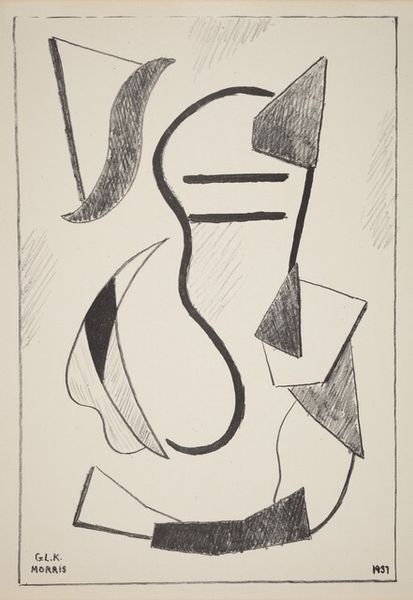 Curator: Welcome. Here we have Ossip Zadkine’s print, "Two Figures". It's rendered with intaglio and ink. What are your immediate thoughts on the piece? Editor: Stark, fragmented. There’s a definite tension between the geometric shapes and the attempt to represent organic human forms. The heavy use of line suggests anxiety or instability, perhaps? Curator: That's an astute observation. Notice how Zadkine employs Cubist principles; he breaks down the figures into geometric components, fracturing their forms across the picture plane. The interplay of line, texture, and the lack of color are all meticulously controlled. Editor: How might this fit into the historical context of early 20th-century art? Did the anxieties reflected through its Cubist visual vocabulary correlate with broader social tensions and shifts, particularly within Europe? Curator: It absolutely did. Many artists were grappling with rapid industrialization, urbanization, and, of course, the looming shadow of war. Cubism was a revolutionary way to challenge traditional representation, and perhaps reflected the shattering of old orders. Note also how the angular forms almost mimic machine parts. Editor: Indeed. I think these jagged contours could symbolize not only an inner psychological tension, but also societal ones related to the dehumanizing effects of industry on people. Curator: I appreciate that you pick up on the feeling of unease; the relationship between form and content cannot be dismissed. But ultimately the abstract structure, the intentional dismemberment and re-assembling is a fascinating demonstration of semiotics in action, and that is a valuable perspective regardless of social context. Editor: True, but an entirely apolitical assessment might overlook ways in which this formalism communicated something resonant about Europe to the wider viewing public. Still, an art's beauty certainly endures regardless of interpretation. Thank you, it’s a lot to reflect on! Curator: And thank you. A thorough examination always includes varied lenses to gain deeper understandings.